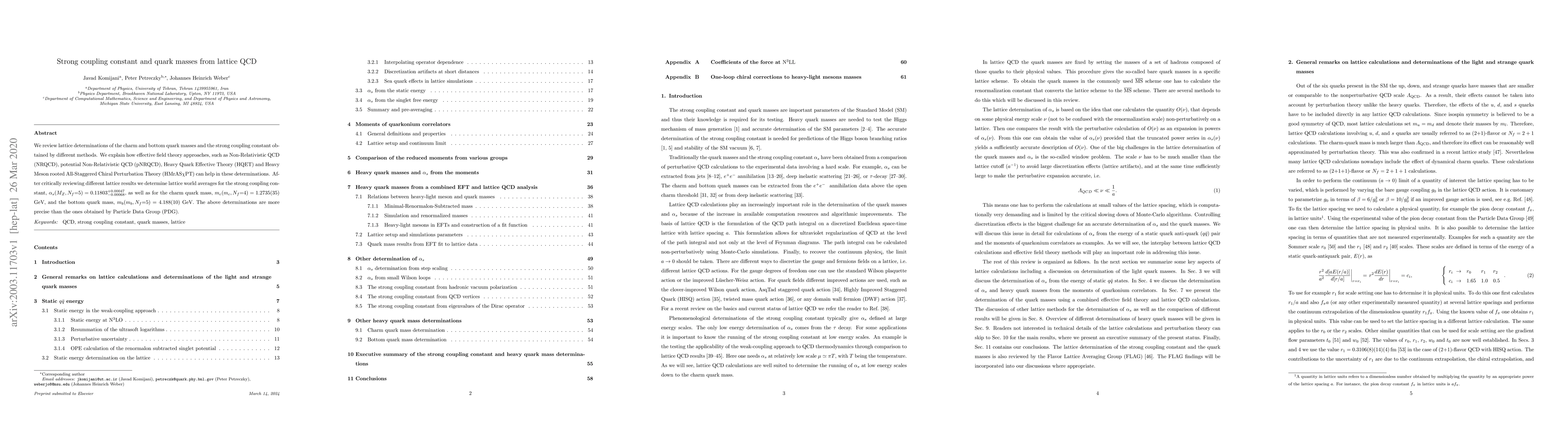 This paper reviews lattice QCD determinations of charm and bottom quark masses and the strong coupling constant, employing various effective field theories. It provides world averages for $\alpha_s(M_Z,N_f{=}5)=0.11803^{+0.00047}_{-0.00068}$, $m_c(m_c,N_f{=}4)=1.2735(35)$ GeV, and $m_b(m_b,N_f{=}5)=4.188(10)$ GeV, surpassing the precision of Particle Data Group values.