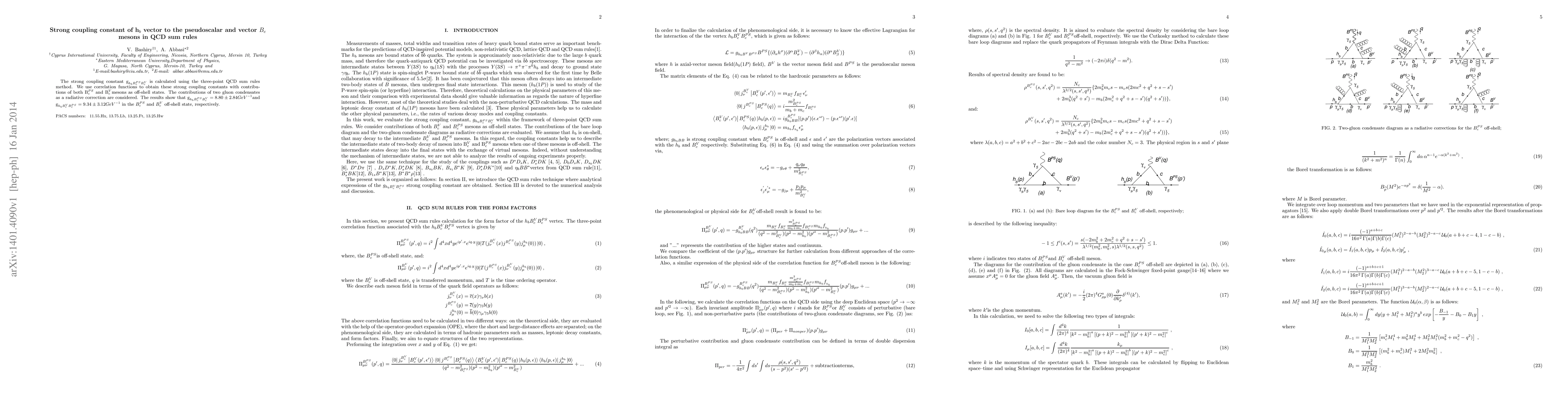 The strong coupling constant g$_{h_{b}B_{c}^{PS}B_{c}^{V}}$ is calculated using the three-point QCD sum rules method. We use correlation functions to obtain these strong coupling constants with contributions of both B$_{c}^{PS} $ and B$_{c}^{V}$mesons as off-shell states. The contributions of two gluon condensates as a radiative correction are considered. The results show that g$_{h_{b}B_{c}^{PS}B_{c}^{V}}=8.80\pm 2.84 GeV^{-1}$and g$_{h_{b}B_{c}^{V} B_{c}^{PS}}=9.34\pm 3.12 GeV^{-1}$ in the $B_{c}^{PS}$ and $B_{c}^{V}$ off-shell state, respectively.
