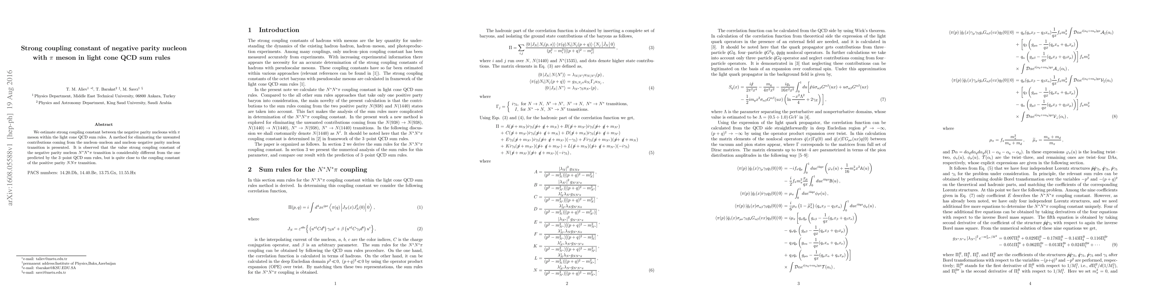 Summary: This study estimates the strong coupling constant for the negative parity nucleon with $\pi$ meson using light cone QCD sum rules, presenting a method to eliminate unwanted contributions. The calculated coupling constant for the $N^\ast N^\ast \pi$ transition differs significantly from predictions but aligns closely with the positive parity $N N \pi$ transition.