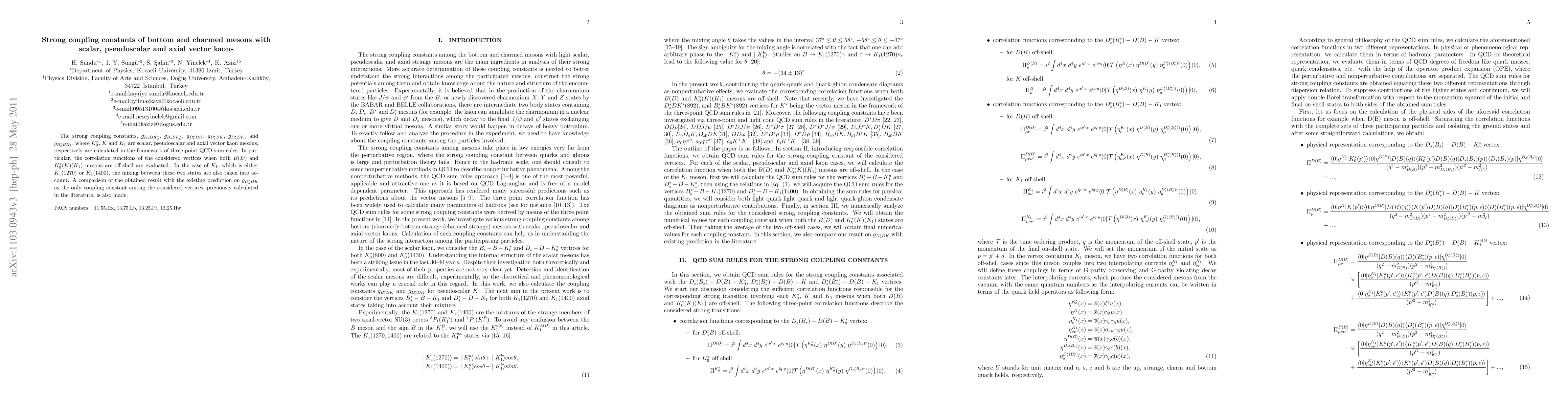 This paper calculates various strong coupling constants between bottom and charmed mesons and kaon mesons using three-point QCD sum rules, considering off-shell effects and mixing for $K_1$ mesons. The results are compared with existing predictions for $g_{D^{\ast}_{s}D K}$.