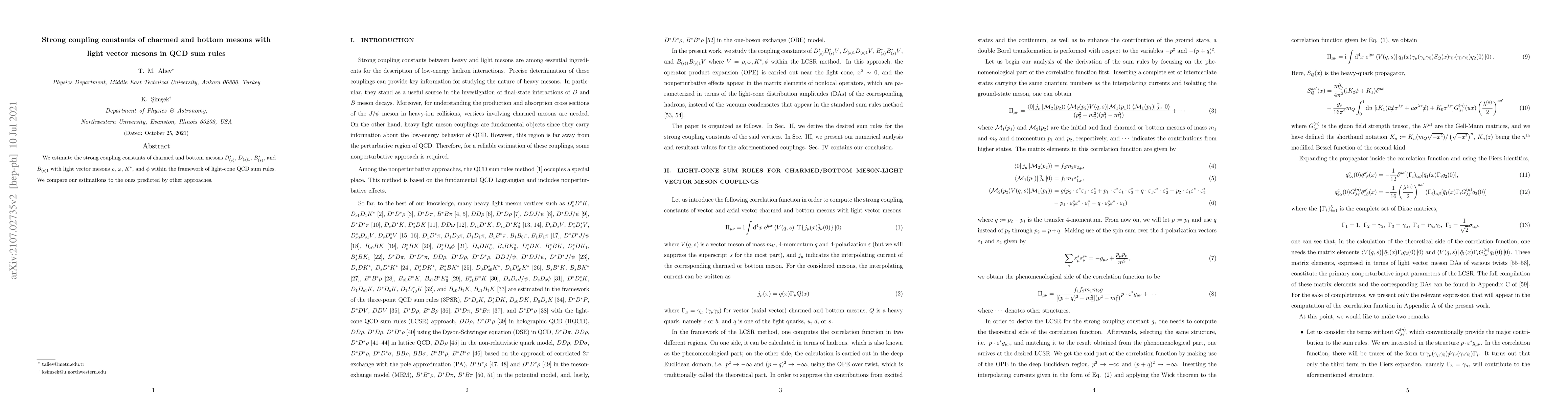 This paper estimates the strong coupling constants between charmed and bottom mesons and light vector mesons using light-cone QCD sum rules, and compares these findings to predictions from other theoretical approaches.