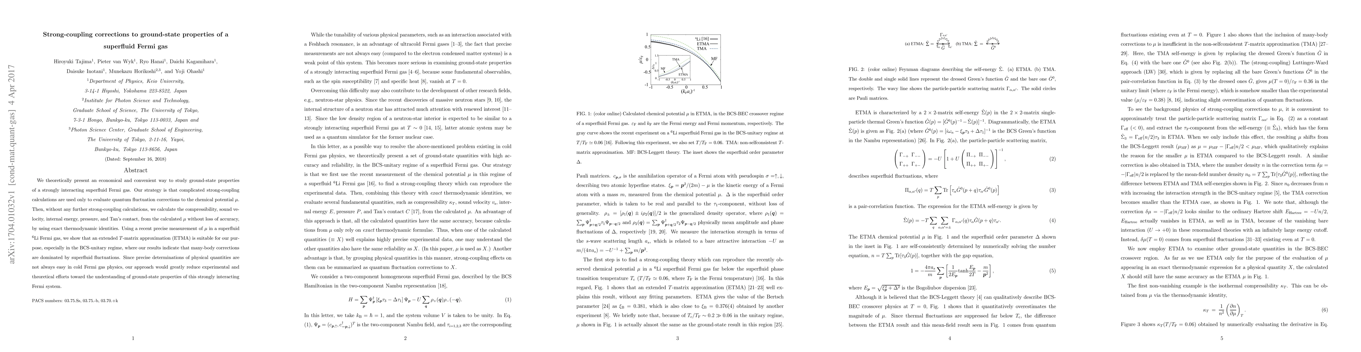 We theoretically present an economical and convenient way to study ground-state properties of a strongly interacting superfluid Fermi gas. Our strategy is that complicated strong-coupling calculations are used only to evaluate quantum fluctuation corrections to the chemical potential $\mu$. Then, without any further strong-coupling calculations, we calculate the compressibility, sound velocity, internal energy, pressure, and Tan's contact, from the calculated $\mu$ without loss of accuracy, by using exact thermodynamic identities. Using a recent precise measurement of $\mu$ in a superfluid $^6$Li Fermi gas, we show that an extended $T$-matrix approximation (ETMA) is suitable for our purpose, especially in the BCS-unitary regime, where our results indicate that many-body corrections are dominated by superfluid fluctuations. Since precise determinations of physical quantities are not always easy in cold Fermi gas physics, our approach would greatly reduce experimental and theoretical efforts toward the understanding of ground-state properties of this strongly interacting Fermi system.