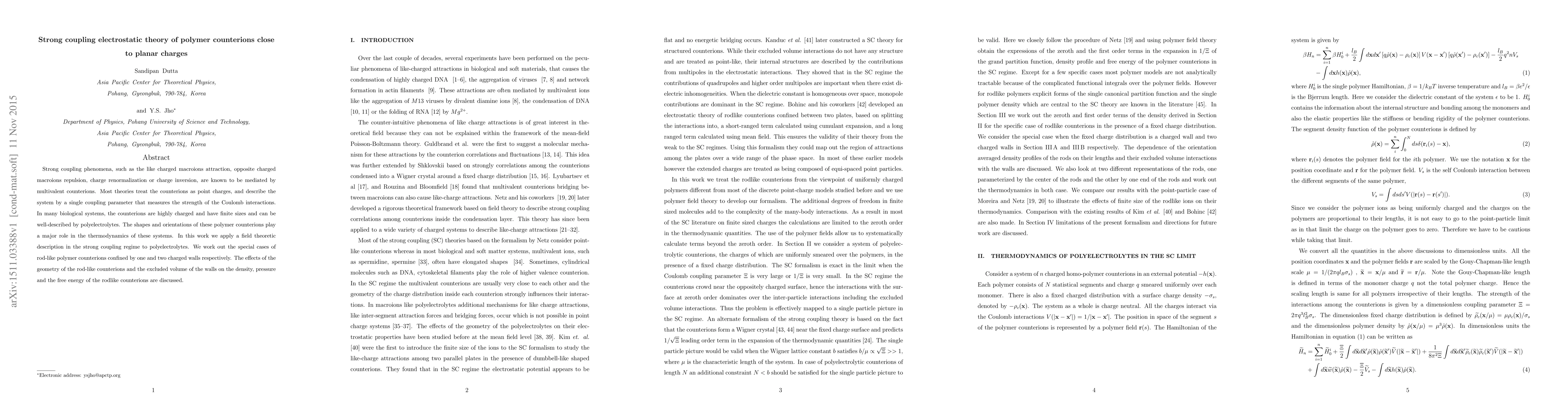 Strong coupling phenomena, such as the like charged macroions attraction, opposite charged macroions repulsion, charge renormalization or charge inversion, are known to be mediated by multivalent counterions. Most theories treat the counterions as point charges, and describe the system by a single coupling parameter that measures the strength of the Coulomb interactions. In many biological systems, the counterions are highly charged and have finite sizes and can be well-described by polyelectrolytes. The shapes and orientations of these polymer counterions play a major role in the thermodynamics of these systems. In this work we apply a field theoretic description in the strong coupling regime to polyelectrolytes. We work out the special cases of rod-like polymer counterions confined by one and two charged walls respectively. The effects of the geometry of the rod-like counterions and the excluded volume of the walls on the density, pressure and the free energy of the rodlike counterions are discussed.