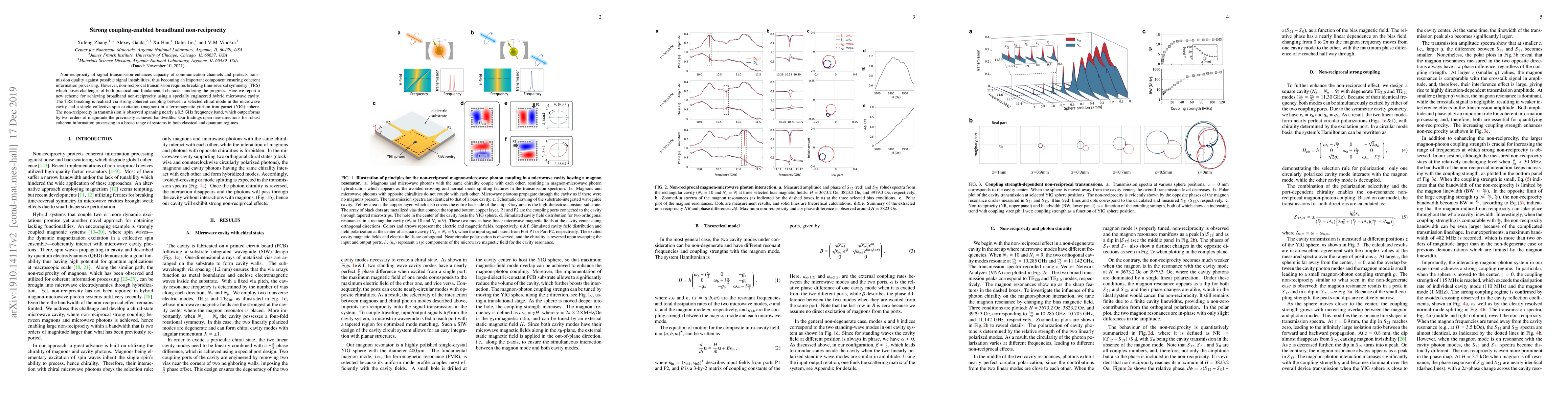 Non-reciprocity of signal transmission enhances capacity of communication channels and protects transmission quality against possible signal instabilities, thus becoming an important component ensuring coherent information processing. However, non-reciprocal transmission requires breaking time-reversal symmetry (TRS) which poses challenges of both practical and fundamental character hindering the progress. Here we report a new scheme for achieving broadband non-reciprocity using a specially engineered hybrid microwave cavity. The TRS breaking is realized via strong coherent coupling between a selected chiral mode in the microwave cavity and a single collective spin excitation (magnon) in a ferromagnetic yttrium iron garnet (YIG) sphere. The non-reciprocity in transmission is observed spanning nearly a 0.5 GHz frequency band, which outperforms by two orders of magnitude the previously achieved bandwidths. Our findings open new directions for robust coherent information processing in a broad range of systems in both classical and quantum regimes.