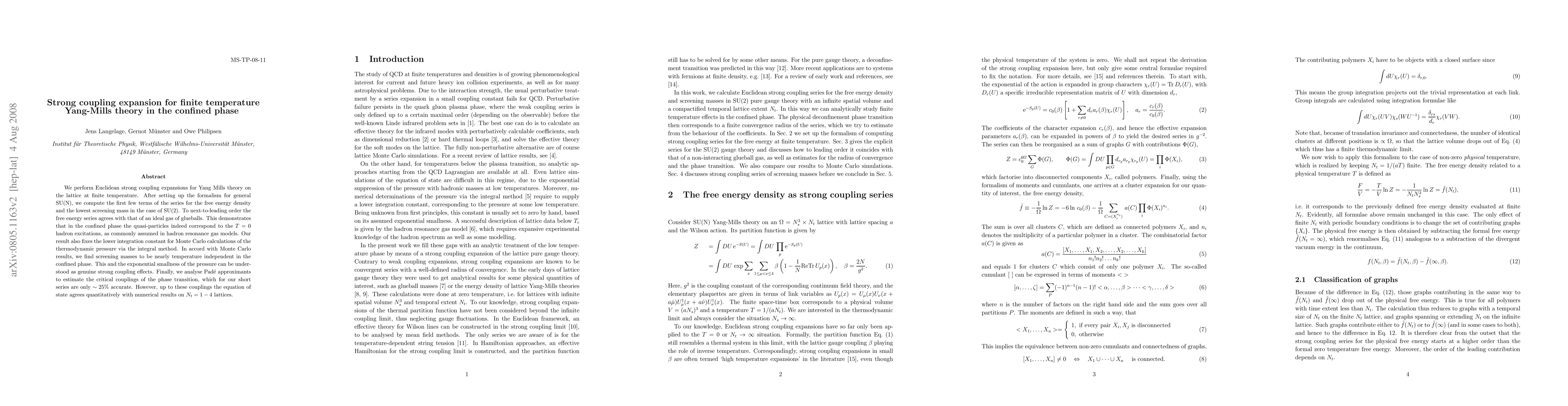 We perform euclidean strong coupling expansions for Yang Mills theory on the lattice at finite temperature. After setting up the formalism for general SU(N), we compute the first few terms of the series for the free energy density and the lowest screening mass in the case of SU(2). To next-to-leading order the free energy series agrees with that of an ideal gas of glueballs. This demonstrates that in the confined phase the quasi-particles indeed correspond to the T=0 hadron excitations, as commonly assumed in hadron resonance gas models. Our result also fixes the lower integration constant for Monte Carlo calculations of the thermodynamic pressure via the integral method. In accord with Monte Carlo results, we find screening masses to be nearly temperature independent in the confined phase. This and the exponential smallness of the pressure can be understood as genuine strong coupling effects. Finally, we analyse Pade approximants to estimate the critical couplings of the phase transition, which for our short series are only ~25% accurate. However, up to these couplings the equation of state agrees quantitatively with numerical results on N_t=1-4 lattices.