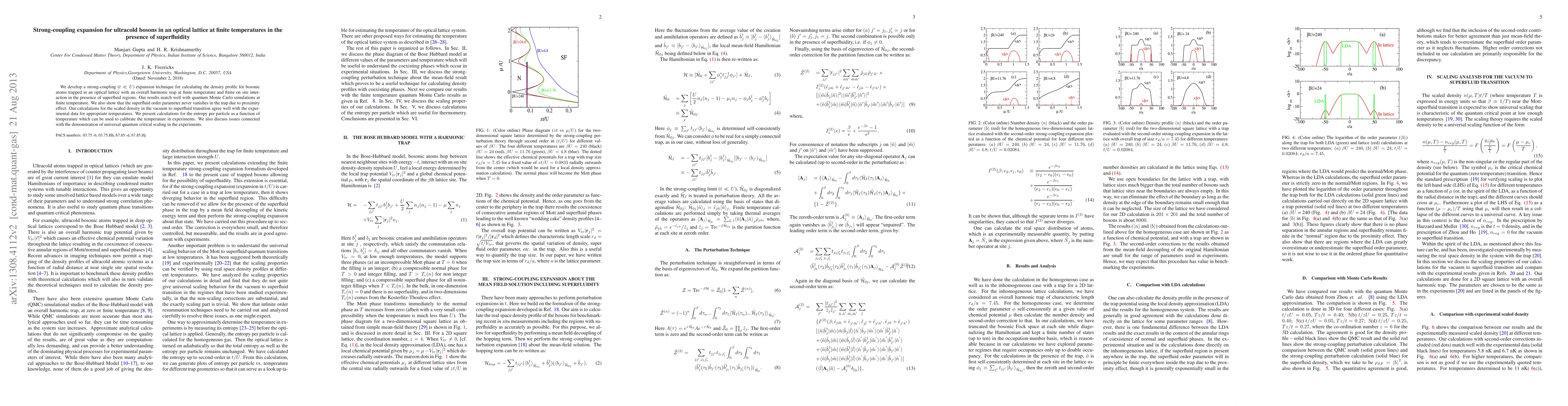 We develop a strong-coupling ($t \ll U$) expansion technique for calculating the density profile for bosonic atoms trapped in an optical lattice with an overall harmonic trap at finite temperature and finite on site interaction in the presence of superfluid regions. Our results match well with quantum Monte Carlo simulations at finite temperature. We also show that the superfluid order parameter never vanishes in the trap due to proximity effect. Our calculations for the scaled density in the vacuum to superfluid transition agree well with the experimental data for appropriate temperatures. We present calculations for the entropy per particle as a function of temperature which can be used to calibrate the temperature in experiments. We also discuss issues connected with the demonstration of universal quantum critical scaling in the experiments.