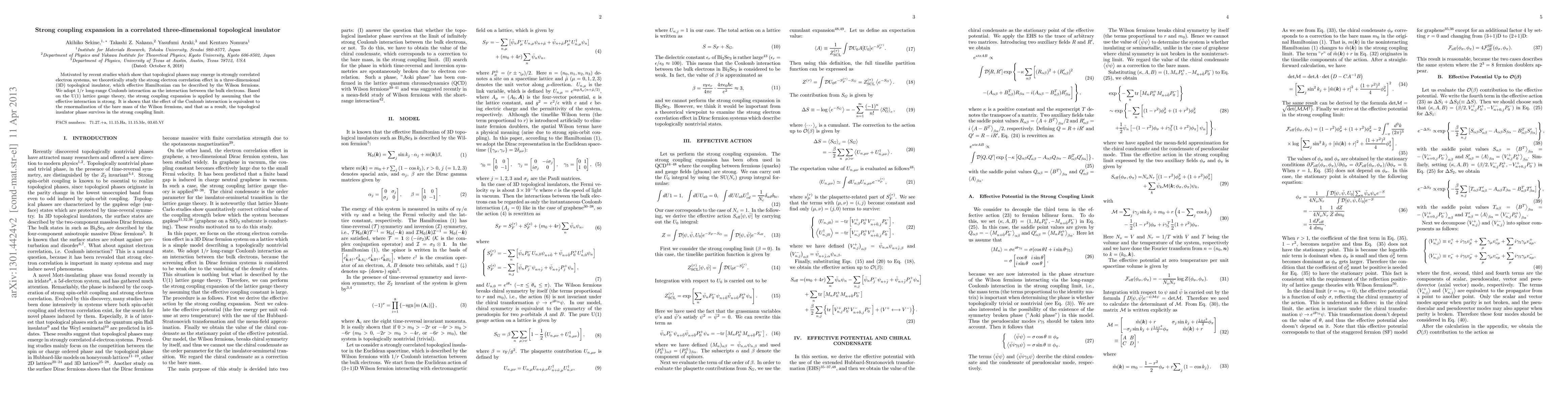 The paper presents a detailed strong coupling expansion analysis using U(1) lattice gauge theory for Wilson fermions, providing a comprehensive understanding of the long-range Coulomb interaction effects on topological insulators.