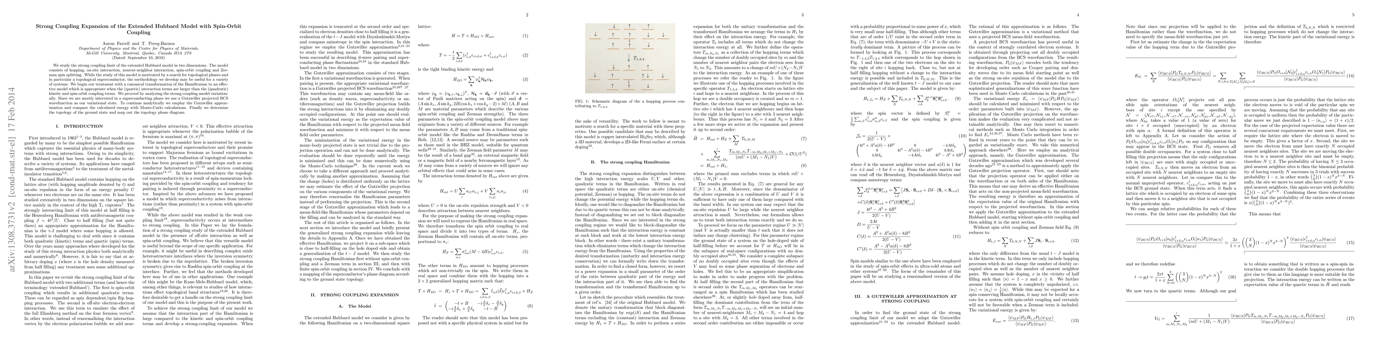 We study the strong coupling limit of the extended Hubbard model in two dimensions. The model consists of hopping, on-site interaction, nearest-neighbor interaction, spin-orbit coupling and Zeeman spin splitting. While the study of this model is motivated by a search for topological phases and in particular a topological superconductor, the methodology we develop may be useful for a variety of systems. We begin our treatment with a canonical transformation of the Hamiltonian to an effective model which is appropriate when the (quartic) interaction terms are larger than the (quadratic) kinetic and spin-orbit coupling terms. We proceed by analyzing the strong coupling model variationally. Since we are mostly interested in a superconducting phase we use a Gutzwiller projected BCS wavefunction as our variational state. To continue analytically we employ the Gutzwiller approximation and compare the calculated energy with Monte-Carlo calculations. Finally we determine the topology of the ground state and map out the topology phase diagram.