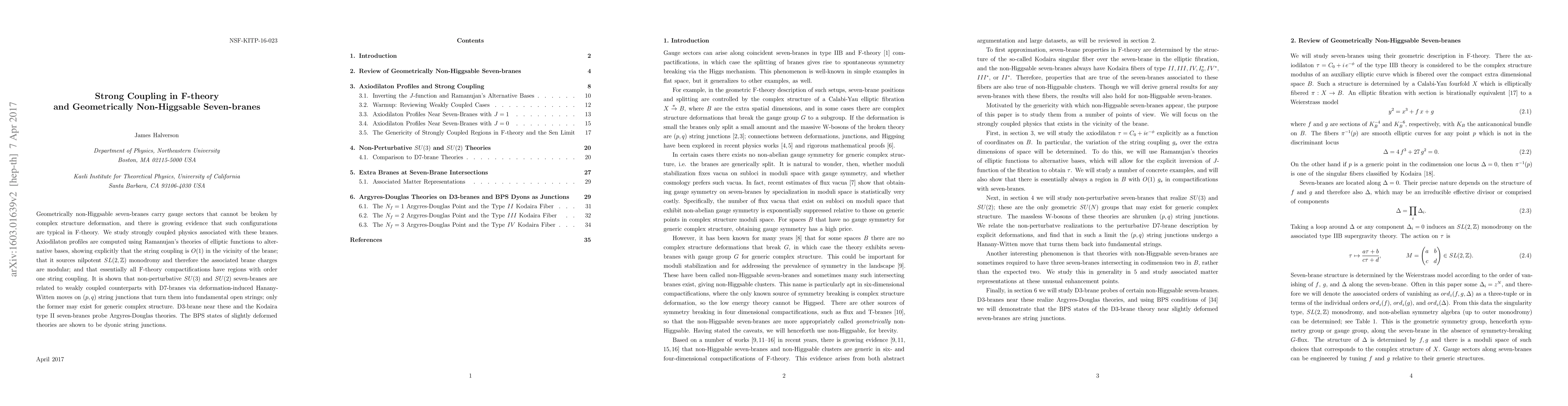 This paper explores strongly coupled physics in F-theory related to geometrically non-Higgsable seven-branes, demonstrating that string coupling is significant near these branes, causing modular brane charges and nilpotent monodromy. It also links non-perturbative seven-branes to weakly coupled D7-branes through deformation-induced moves.