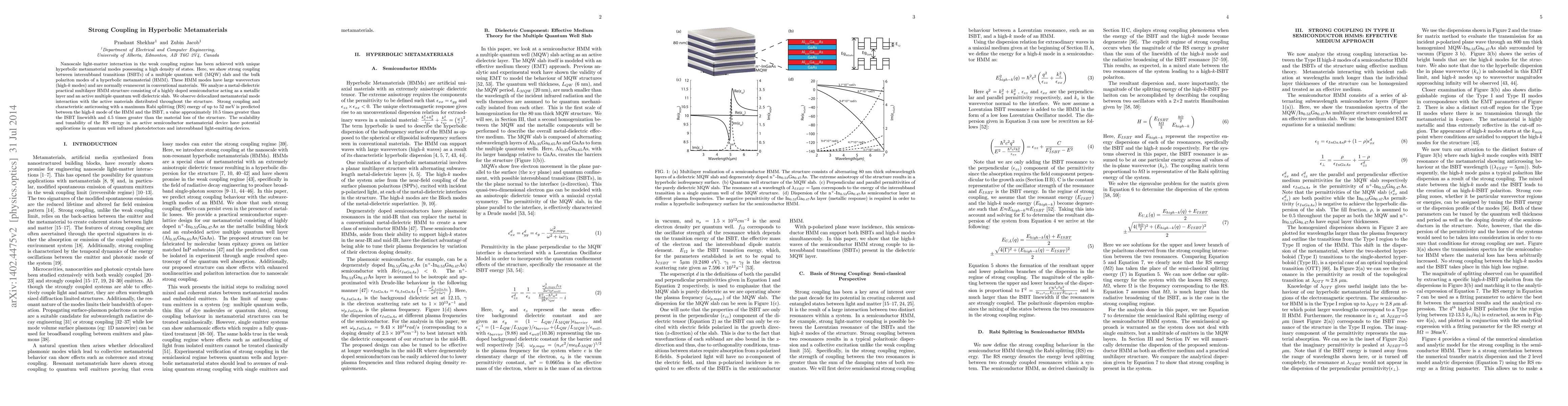 Nanoscale light-matter interaction in the weak-coupling regime has been achieved with unique hyperbolic metamaterial modes possessing a high density of states. Here, we show strong coupling between intersubband transitions (ISBTs) of a multiple quantum well (MQW) slab and the bulk polariton modes of a hyperbolic metamaterial (HMM). These HMM modes have large wave vectors (high-k modes) and are normally evanescent in conventional materials. We analyze a metal-dielectric practical multilayer HMM structure consisting of a highly doped semiconductor acting as a metallic layer and an active multiple quantum well dielectric slab. We observe delocalized metamaterial mode interaction with the active materials distributed throughout the structure. Strong coupling and characteristic anticrossing with a maximum Rabi splitting (RS) energy of up to 52 meV is predicted between the high-k mode of the HMMand the ISBT, a value approximately 10.5 times greater than the ISBT linewidth and 4.5 times greater than the material loss of the structure. The scalability and tunability of the RS energy in an active semiconductor metamaterial device have potential applications in quantum well infrared photodetectors and intersubband light-emitting devices.