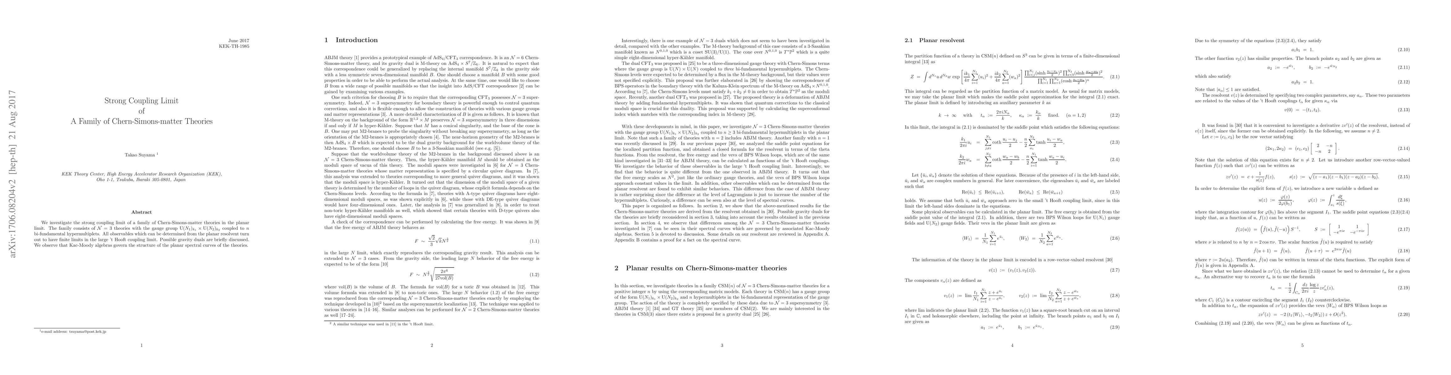 We investigate the strong coupling limit of a family of Chern-Simons-matter theories in the planar limit. The family consists of ${\cal N}=3$ theories with the gauge group ${\rm U}(N_1)_{k_1}\times{\rm U}(N_2)_{k_2}$ coupled to $n$ bi-fundamental hypermultiplets. All observables which can be determined from the planar resolvent turn out to have finite limits in the large 't Hooft coupling limit. Possible gravity duals are briefly discussed. We observe that Kac-Moody algebras govern the structure of the planar spectral curves of the theories.