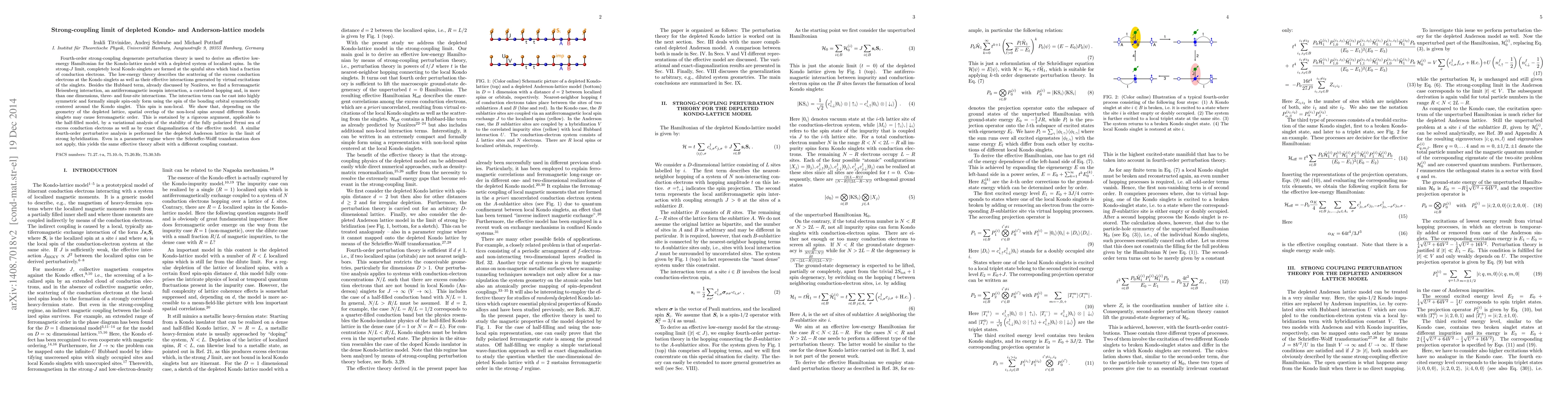 This paper employs fourth-order strong-coupling perturbation theory to derive an effective low-energy Hamiltonian for depleted Kondo- and Anderson-lattice models, revealing various interactions including ferromagnetic and antiferromagnetic terms, and demonstrating potential ferromagnetic order in the lattice geometry.