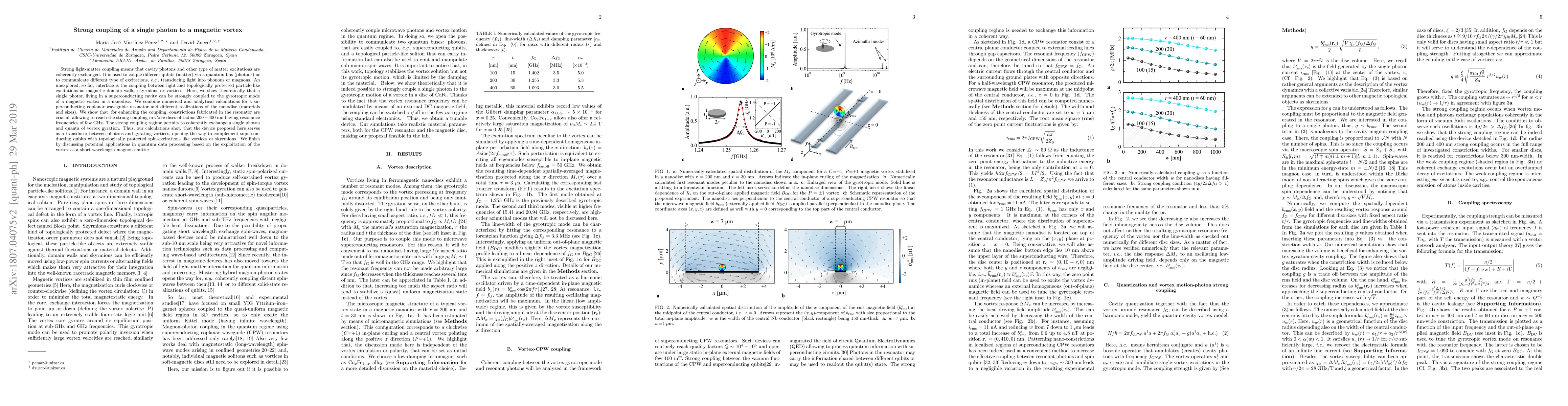 Strong light-matter coupling is a necessary condition for exchanging information in quantum information protocols. It is used to couple different qubits (matter) via a quantum bus (photons) or to communicate different type of excitations, e.g. transducing between light and phonons or magnons. An unexplored, so far, interface is the coupling between light and topologically protected particle like excitations as magnetic domain walls, skyrmions or vortices. Here, we show theoretically that a single photon living in a superconducting cavity can be coupled strongly to the gyrotropic mode of a magnetic vortex in a nanodisc. We combine numerical and analytical calculations for a superconducting coplanar waveguide resonator and different realizations of the nanodisc (materials and sizes). We show that, for enhancing the coupling, constrictions fabricated in the resonator are beneficial, allowing to reach the strong coupling in CoFe discs of radius $200-400$ nm having resonance frequencies of few GHz. The strong coupling regime permits to exchange coherently a single photon and quanta of vortex excitations. Thus, our calculations show that the device proposed here serves as a transducer between photons and gyrating vortices, opening the way to complement superconducting qubits with topologically protected spin-excitations like vortices or skyrmions. We finish by discussing potential applications in quantum data processing based on the exploitation of the vortex as a short-wavelength magnon emitter.