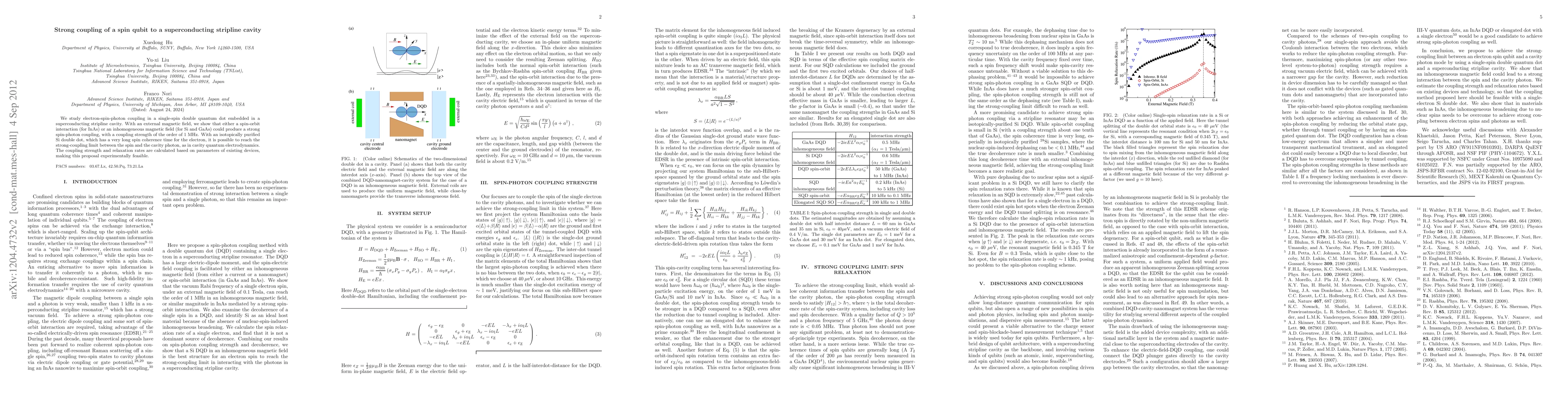 This paper explores strong coupling between a spin qubit in a double quantum dot and a superconducting stripline cavity, demonstrating potential coupling strengths of around 1 MHz. The study highlights the feasibility of achieving strong-coupling limits in cavity quantum electrodynamics using isotopically purified silicon double dots.
