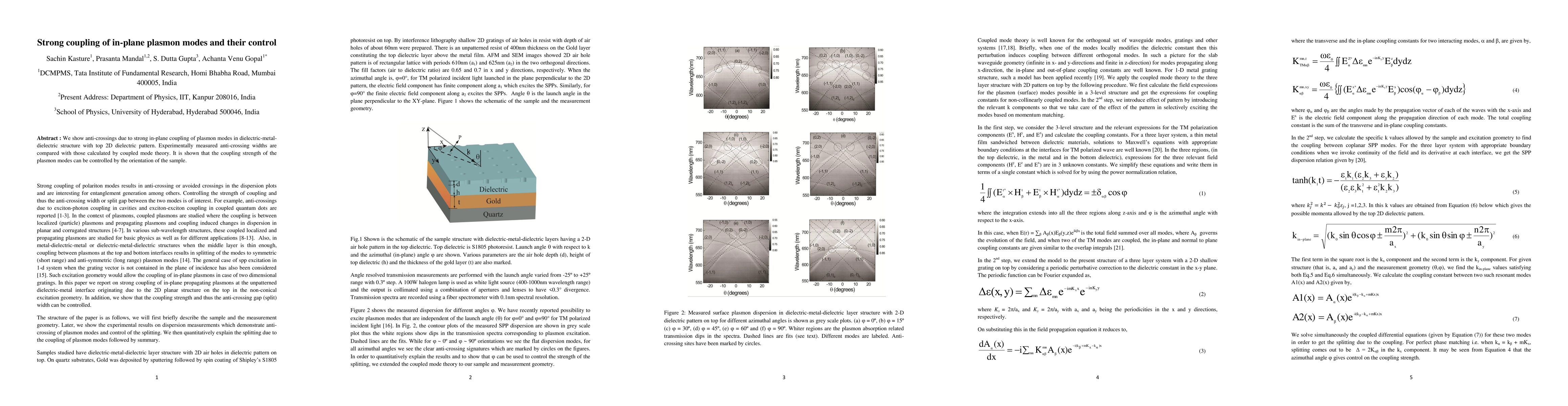 This paper demonstrates strong coupling of in-plane plasmon modes in a dielectric-metal-dielectric structure with a top 2D dielectric pattern, showing anti-crossings experimentally and theoretically. The coupling strength is found to be controllable via the sample's orientation.