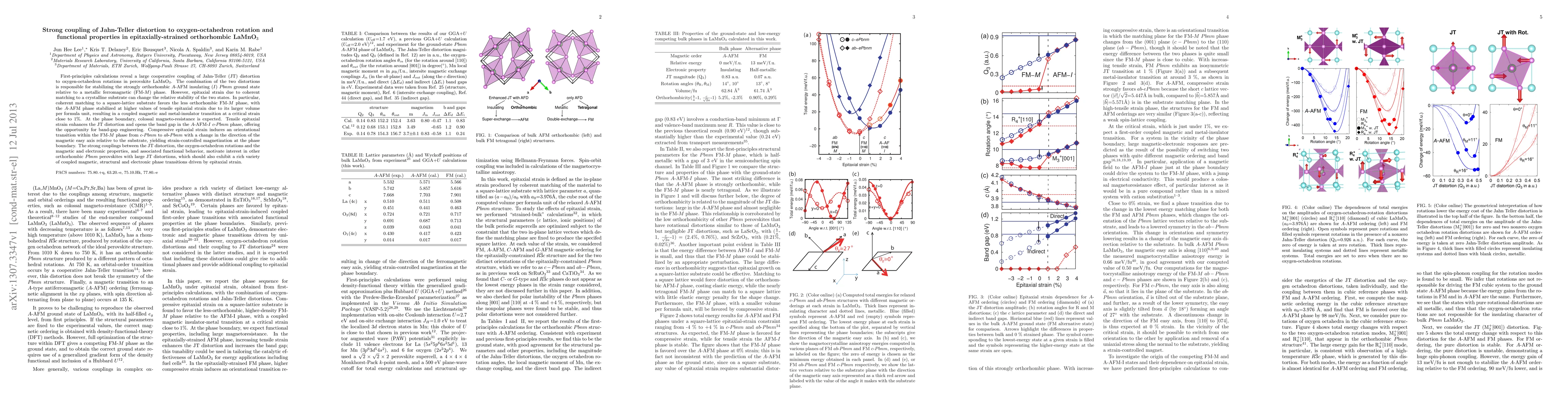 First-principles calculations reveal a large cooperative coupling of Jahn-Teller (JT) distortion to oxygen-octahedron rotations in perovskite LaMnO$_3$. The combination of the two distortions is responsible for stabilizing the strongly orthorhombic $A$-AFM insulating ($I$) $Pbnm$ ground state relative to a metallic ferromagnetic (FM-$M$) phase. However, epitaxial strain due to coherent matching to a crystalline substrate can change the relative stability of the two states. In particular, coherent matching to a square-lattice substrate favors the less orthorhombic FM-$M$ phase, with the $A$-AFM phase stabilized at higher values of tensile epitaxial strain due to its larger volume per formula unit, resulting in a coupled magnetic and metal-insulator transition at a critical strain close to 1%. At the phase boundary, colossal magneto-resistance is expected. Tensile epitaxial strain enhances the JT distortion and opens the band gap in the $A$-AFM-$I$ $c$-$Pbnm$ phase, offering the opportunity for band-gap engineering. Compressive epitaxial strain induces an orientational transition within the FM-$M$ phase from $c$-$Pbnm$ to $ab$-$Pbnm$ with a change in the direction of the magnetic easy axis relative to the substrate, yielding strain-controlled magnetization at the phase boundary. The strong couplings between the JT distortion, the oxygen-octahedron rotations and the magnetic and electronic properties, and associated functional behavior, motivate interest in other orthorhombic $Pbnm$ perovskites with large JT distortions, which should also exhibit a rich variety of coupled magnetic, structural and electronic phase transitions driven by epitaxial strain.