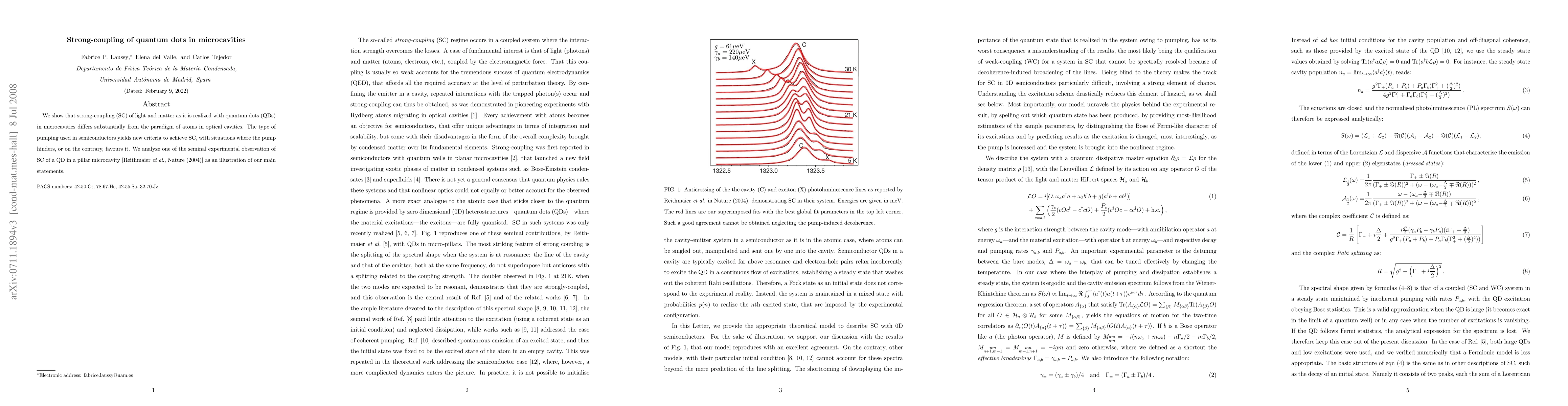 We show that strong-coupling (SC) of light and matter as it is realized with quantum dots (QDs) in microcavities differs substantially from the paradigm of atoms in optical cavities. The type of pumping used in semiconductors yields new criteria to achieve SC, with situations where the pump hinders, or on the contrary, favours it. We analyze one of the seminal experimental observation of SC of a QD in a pillar microcavity [Reithmaier et al., Nature (2004)] as an illustration of our main statements.