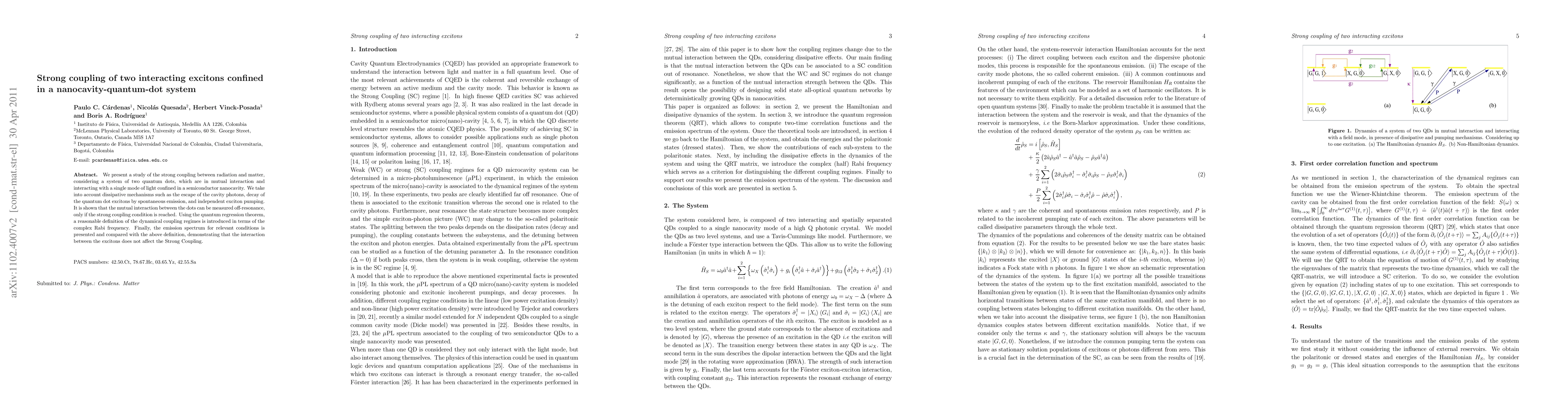 This paper investigates the strong coupling dynamics between two interacting excitons in a nanocavity-quantum-dot system, highlighting the conditions under which mutual interaction can be measured off-resonance. The study introduces a definition of dynamical coupling regimes based on the complex Rabi frequency and shows that exciton interaction does not disrupt the strong coupling phenomenon.