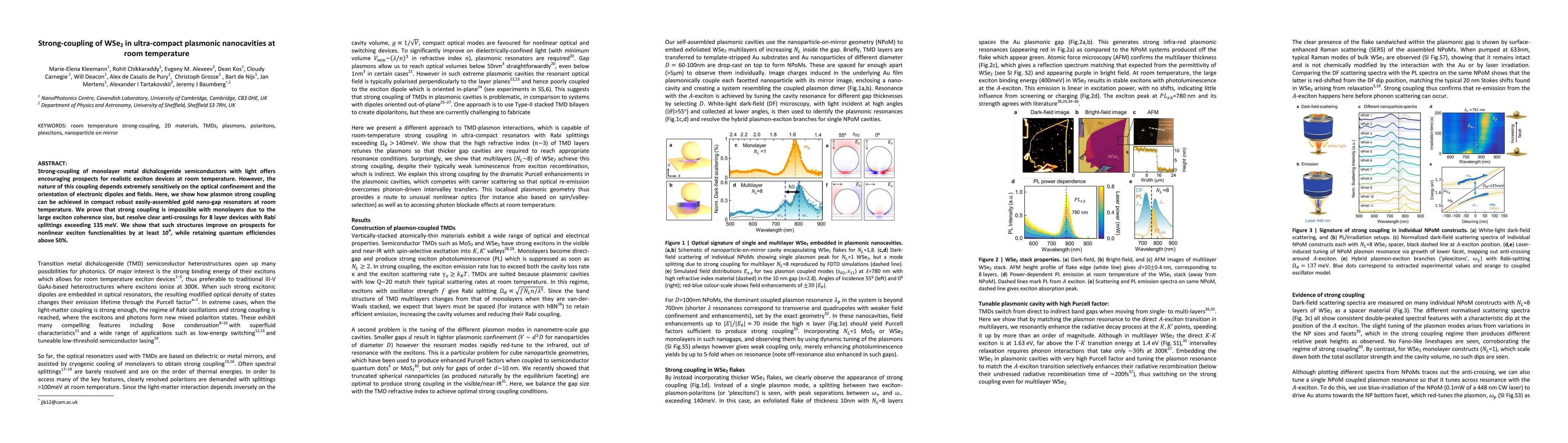 This paper demonstrates strong-coupling of WSe2 in compact plasmonic nanocavities, achieving Rabi splittings exceeding 135 meV in 8-layer devices at room temperature. It concludes that while monolayers fail to achieve strong coupling, multilayer configurations significantly enhance nonlinear exciton functionalities with high quantum efficiency.