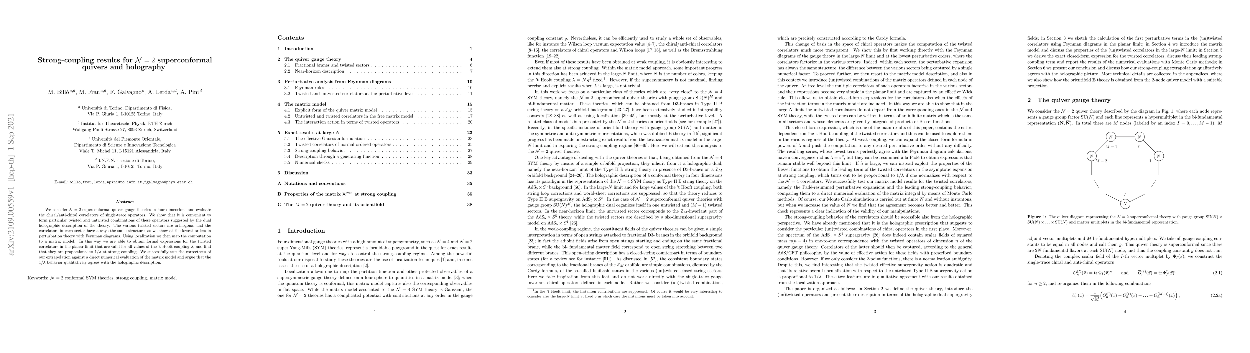 We consider $\mathcal{N}=2$ superconformal quiver gauge theories in four dimensions and evaluate the chiral/anti-chiral correlators of single-trace operators. We show that it is convenient to form particular twisted and untwisted combinations of these operators suggested by the dual holographic description of the theory. The various twisted sectors are orthogonal and the correlators in each sector have always the same structure, as we show at the lowest orders in perturbation theory with Feynman diagrams. Using localization we then map the computation to a matrix model. In this way we are able to obtain formal expressions for the twisted correlators in the planar limit that are valid for all values of the 't Hooft coupling $\lambda$, and find that they are proportional to $1/\lambda$ at strong coupling. We successfully test the correctness of our extrapolation against a direct numerical evaluation of the matrix model and argue that the $1/\lambda$ behavior qualitatively agrees with the holographic description.