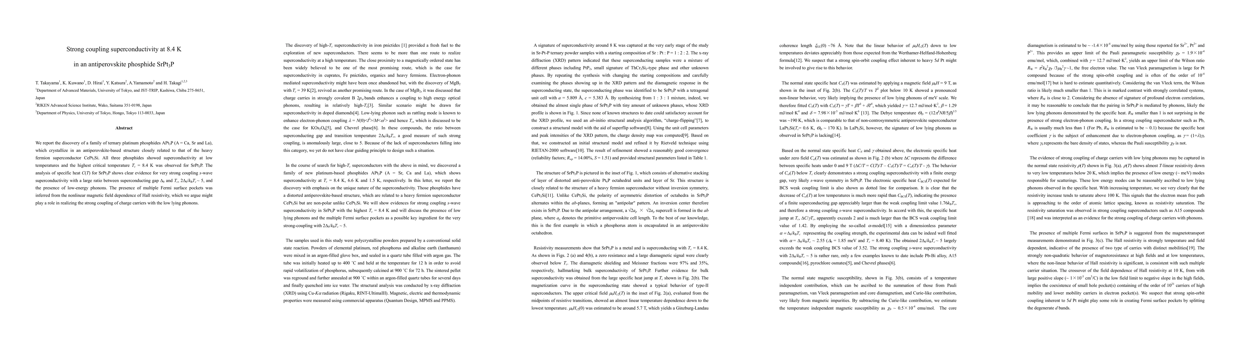 We report the discovery of a family of ternary platinum phosphides APt3P (A = Ca, Sr and La), which crystallize in an antiperovskite-based structure closely related to that of the heavy fermion superconductor CePt3Si. All three phosphides showed superconductivity at low temperatures and the highest critical temperature Tc = 8.4 K was observed for SrPt3P. The analysis of specific heat C(T) for SrPt3P shows clear evidence for very strong coupling s-wave superconductivity with a large ratio between superconducting gap D0 and Tc, 2D0/kBTc ~ 5, and the presence of low-energy phonons. The presence of multiple Fermi surface pockets was inferred from the nonlinear magnetic field dependence of Hall resistivity, which we argue might play a role in realizing the strong coupling of charge carriers with the low lying phonons.