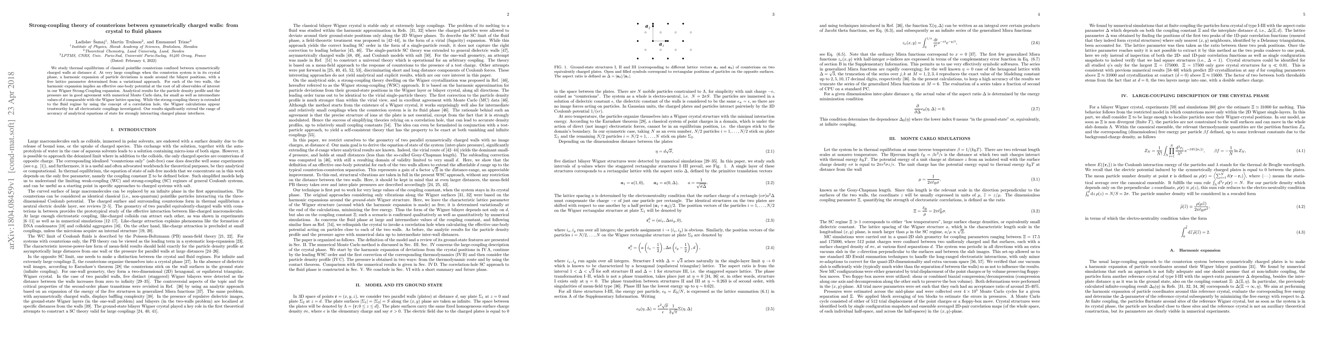 This paper develops a strong-coupling theory for counterions between symmetrically charged walls, showing analytical results for particle density and pressure that match Monte Carlo simulations. The theory extends from the crystal to fluid phases, providing accurate equations of state for strongly interacting charged interfaces.