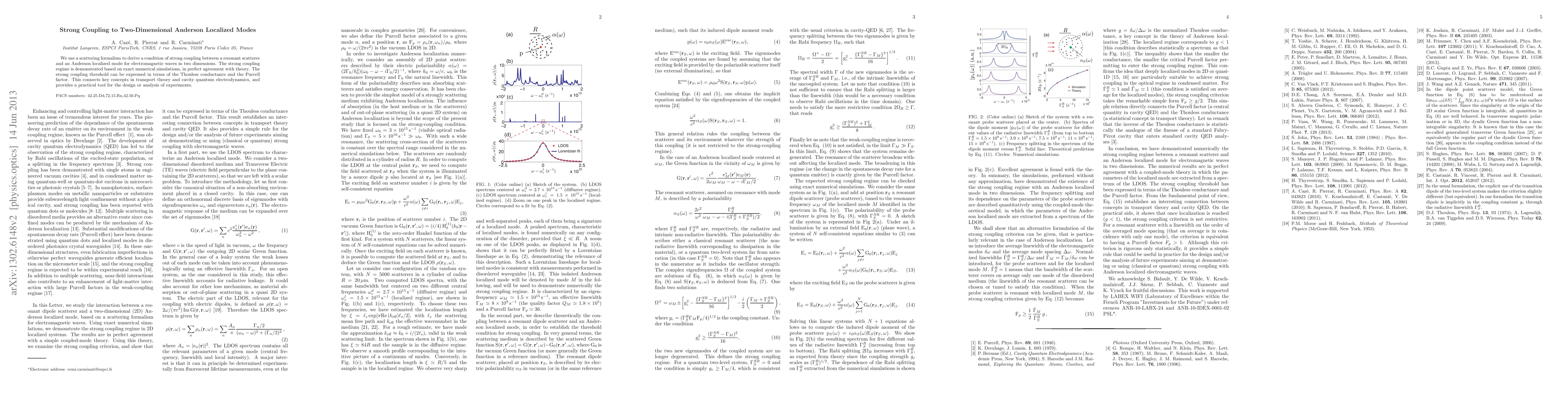 The paper presents a scattering formalism to determine strong coupling between a resonant scatterer and 2D Anderson localized modes for electromagnetic waves. Numerical simulations validate the theory, linking strong coupling threshold to Thouless conductance and Purcell factor, bridging transport theory and cavity quantum electrodynamics.