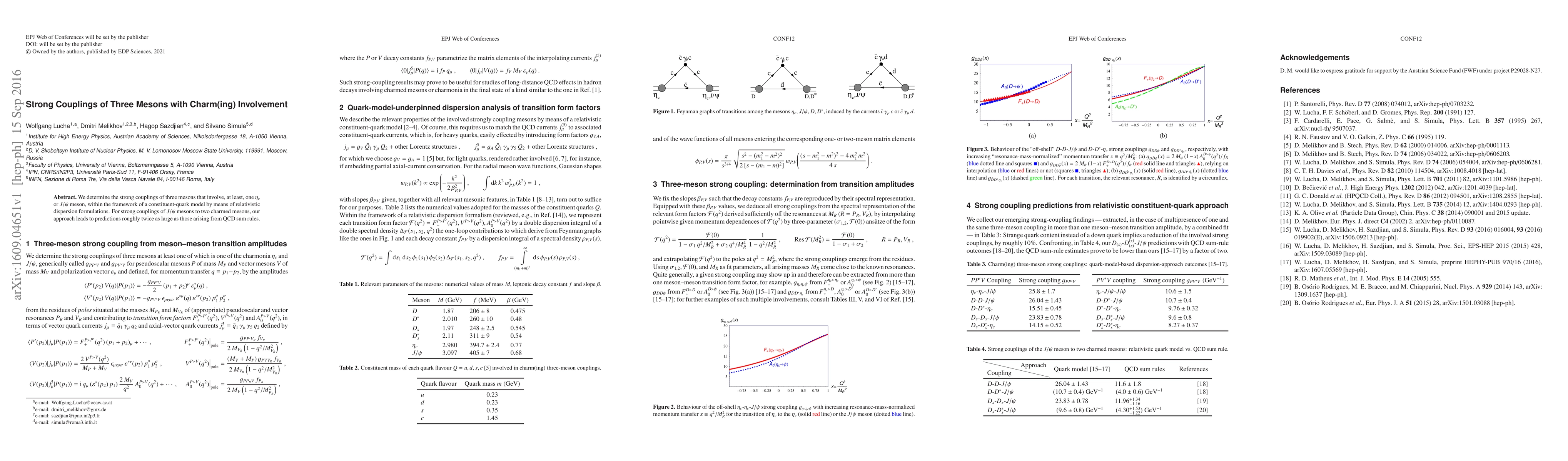 We determine the strong couplings of three mesons that involve, at least, one $\eta_c$ or $J/\psi$ meson, within the framework of a constituent-quark model by means of relativistic dispersion formulations. For strong couplings of $J/\psi$ mesons to two charmed mesons, our approach leads to predictions roughly twice as large as those arising from QCD sum rules.
