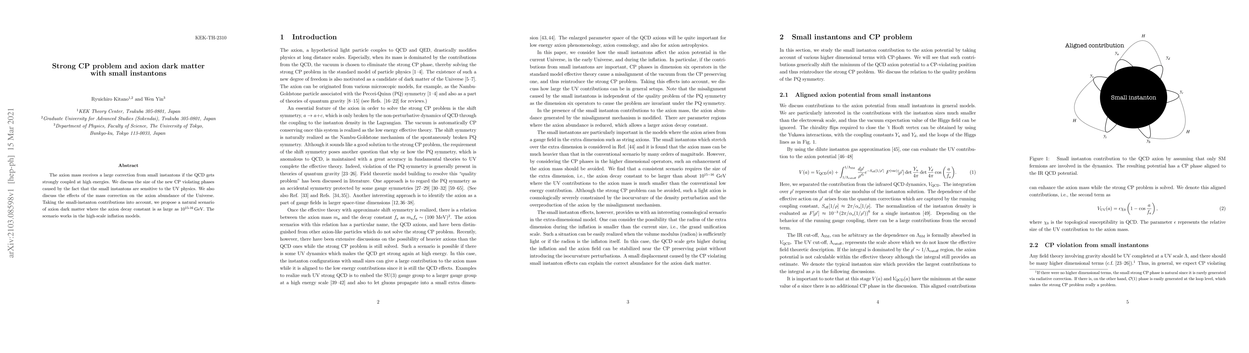 The axion mass receives a large correction from small instantons if the QCD gets strongly coupled at high energies. We discuss the size of the new CP violating phases caused by the fact that the small instantons are sensitive to the UV physics. We also discuss the effects of the mass correction on the axion abundance of the Universe. Taking the small-instanton contributions into account, we propose a natural scenario of axion dark matter where the axion decay constant is as large as $10^{15\text{-}16}$GeV. The scenario works in the high-scale inflation models.