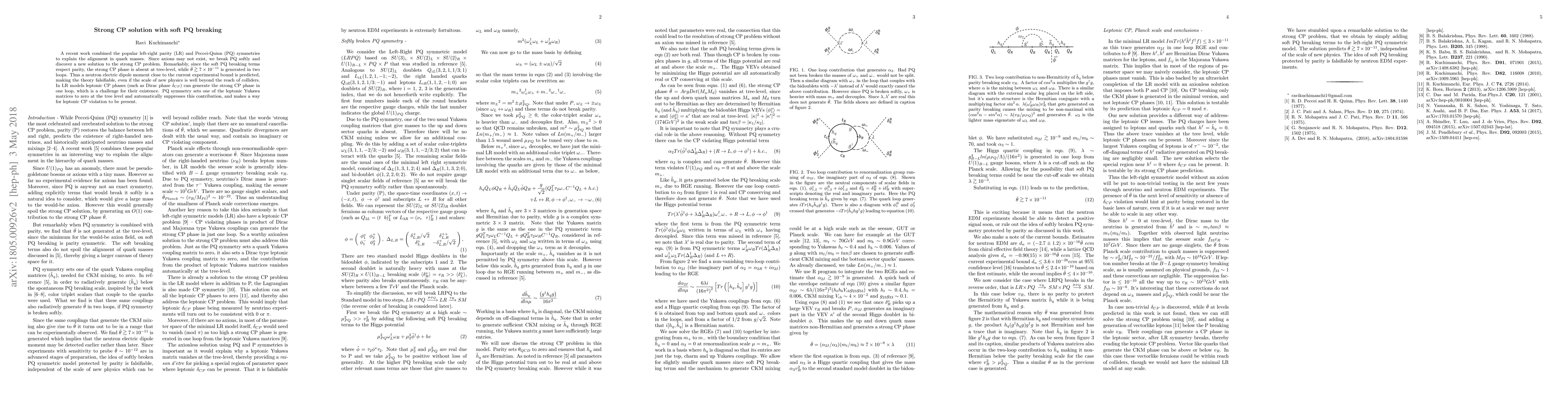 A recent work combined the popular left-right parity (LR) and Peccei-Quinn (PQ) symmetries to explain the alignment in quark masses. Since axions may not exist, we break PQ softly and discover a new solution to the strong CP problem. Remarkably, since the soft PQ breaking terms respect parity, the strong CP phase is absent at tree-level, while $\bar{\theta} \gtrsim 7 \times 10^{-11}$ is generated in two loops. Thus a neutron electric dipole moment close to the current experimental bound is predicted, making the theory falsifiable, even if the scale of new physics is well beyond the reach of colliders. In LR models leptonic CP phases (such as Dirac phase $\delta_{CP}$) can generate the strong CP phase in one loop, which is a challenge for their existence. PQ symmetry sets one of the leptonic Yukawa matrices to zero at the tree level and automatically suppresses this contribution, and makes a way for leptonic CP violation to be present.