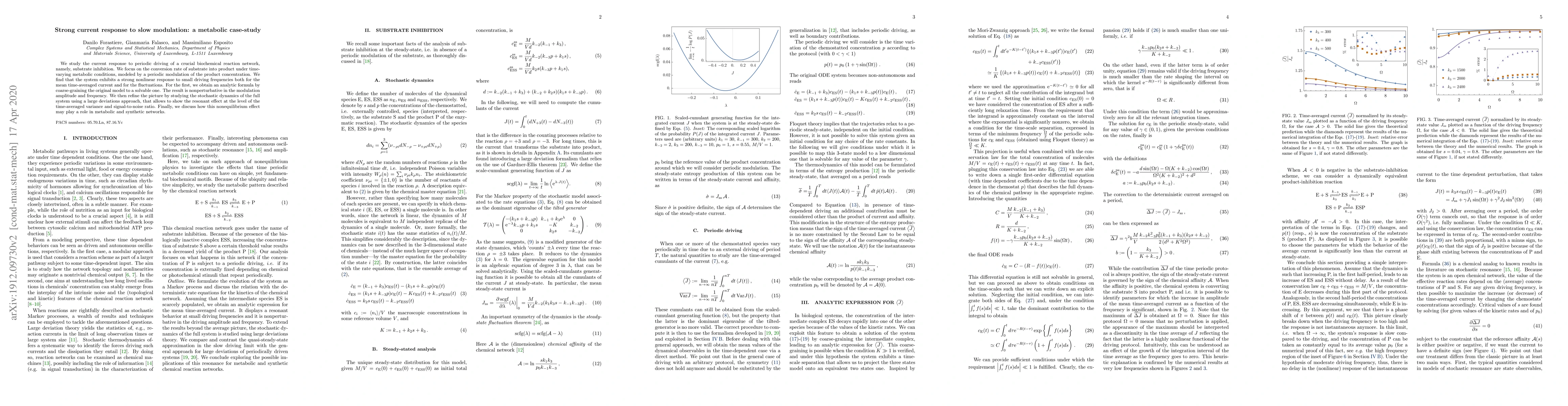 We study the current response to periodic driving of a crucial biochemical reaction network, namely, substrate inhibition. We focus on the conversion rate of substrate into product under time-varying metabolic conditions, modeled by a periodic modulation of the product concentration. We find that the system exhibits a strong nonlinear response to small driving frequencies both for the mean time-averaged current and for the fluctuations. For the first, we obtain an analytic formula by coarse-graining the original model to a solvable one. The result is nonperturbative in the modulation amplitude and frequency. We then refine the picture by studying the stochastic dynamics of the full system using a large deviations approach, that allows to show the resonant effect at the level of the time-averaged variance and signal-to-noise ratio. Finally, we discuss how this nonequilibrium effect may play a role in metabolic and synthetic networks.