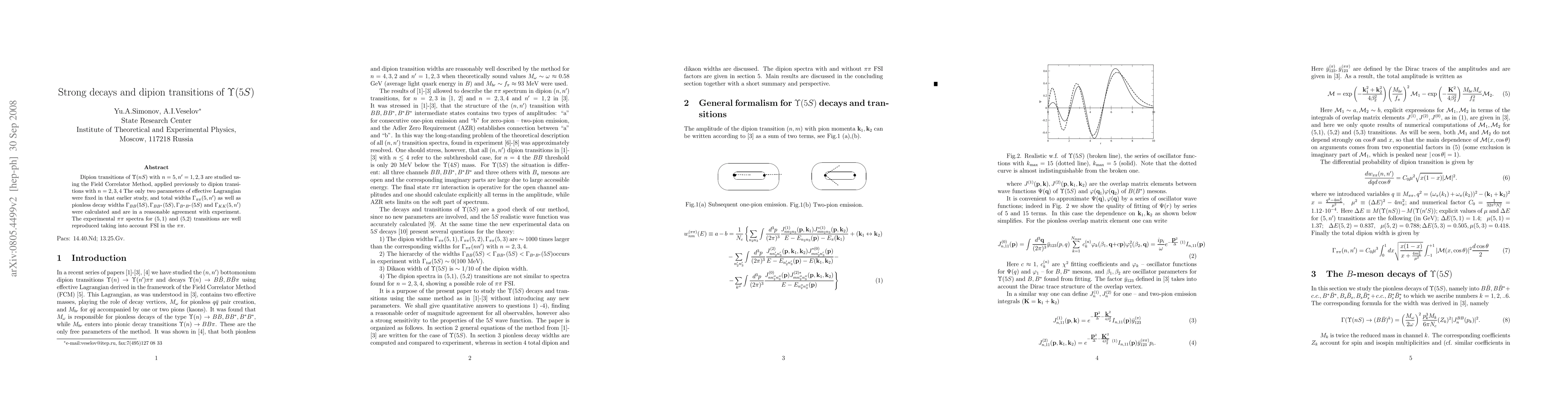 Dipion transitions of $\Upsilon (nS)$ with $n=5, n'=1,2,3$ are studied using the Field Correlator Method, applied previously to dipion transitions with $n=2,3,4$ The only two parameters of effective Lagrangian were fixed in that earlier study, and total widths $\Gamma_{\pi\pi} (5, n')$ as well as pionless decay widths $\Gamma_{BB} (5S), \Gamma_{BB^*} (5S), \Gamma_{B^*B^*}(5S)$ and $\Gamma_{KK} (5, n')$ were calculated and are in a reasonable agreement with experiment. The experimental $\pi\pi$ spectra for $(5,1)$ and (5,2) transitions are well reproduced taking into account FSI in the $\pi\pi$.