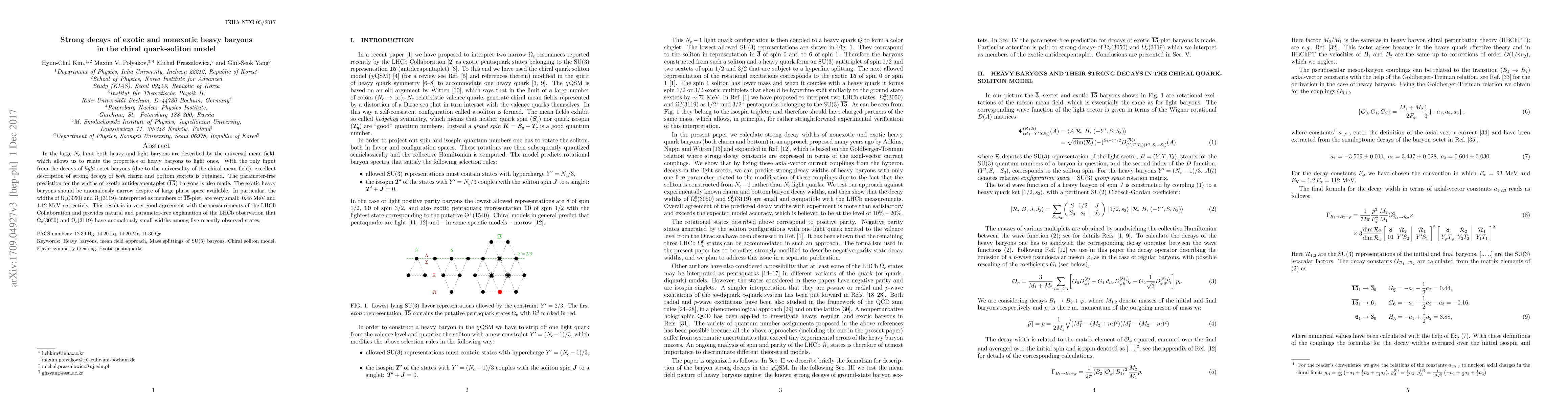 In the large $N_c$ limit both heavy and light baryons are described by the universal mean field, which allows us to relate the properties of heavy baryons to light ones. With the only input from the decays of light octet baryons (due to the universality of the chiral mean field), excellent description of strong decays of both charm and bottom sextets is obtained. The parameter-free prediction for the widths of exotic anti-decapentaplet ($\overline{\boldsymbol{15}}$) baryons is also made. The exotic heavy baryons should be anomalously narrow despite of large phase space available. In particular, the widths of $\Omega_c(3050)$ and $\Omega_c(3119)$, interpreted as members of $\overline{\boldsymbol{15}}$-plet, are very small: 0.48~MeV and 1.12~MeV respectivly. This result is in very good agreement with the measurements of the LHCb Collaboration and provides natural and parameter free explanation of the LHCb observation that $\Omega_c(3050)$ and $\Omega_c(3119)$ have anomalously small widths among five recently observed states.