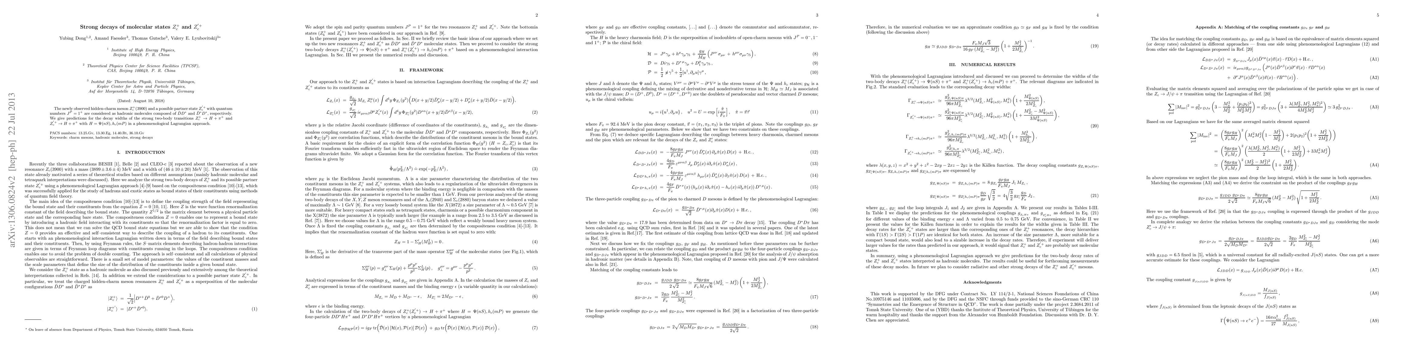 The two newly observed hidden-charm mesons Zc(+)[3900] and a possible partner state Zc'(+)[3950] with quantum numbers J(P) = 1(+) are considered as hadronic molecules composed of bar(D)D* and bar(D)* D*, respectively. We give predictions for the decay widths of the strong two-body transitions Zc(+) -> H + pi(+) and Zc' -> H + pi(+) with H = Psi(nS), hc(mP) in a phenomenological Lagrangian approach.