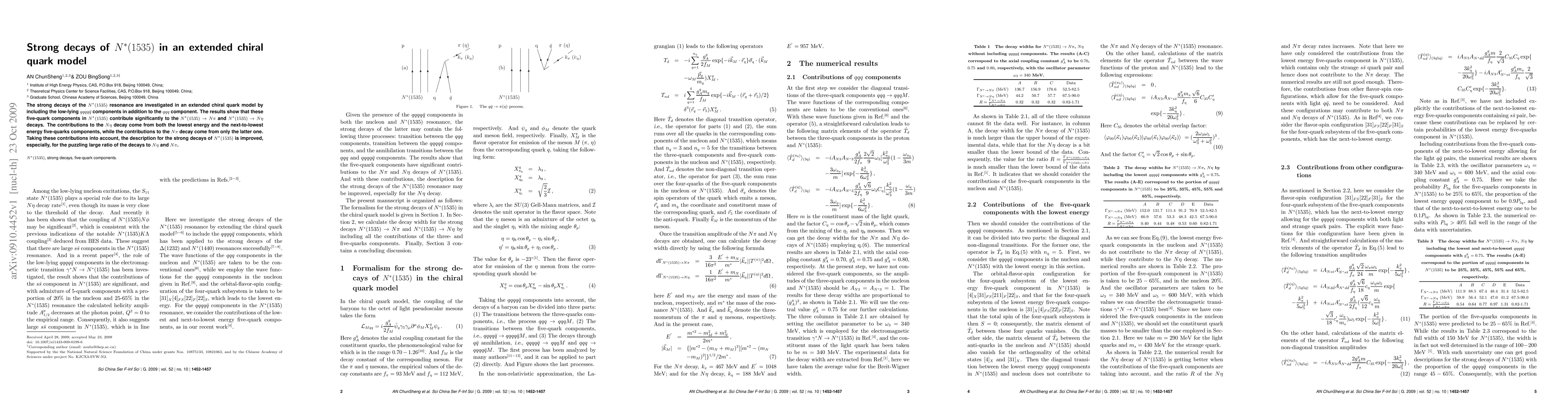 The strong decays of the $N^{*}(1535)$ resonance are investigated in an extended chiral quark model by including the low-lying $qqqq\bar{q}$ components in addition to the $qqq$ component. The results show that these five-quark components in $N^{*}(1535)$ contribute significantly to the $N^{*}(1535)\to N\pi$ and $N^{*}(1535)\to N\eta$ decays. The contributions to the $N\eta$ decay come from both the lowest energy and the next-to-lowest energy five-quarks components, while the contributions to the $N\pi$ decay come from only the latter one. Taking these contributions into account, the description for the strong decays of $N^{*}(1535)$ is improved, especially, for the puzzling large ratio of the decays to $N\eta$ and $N\pi$.