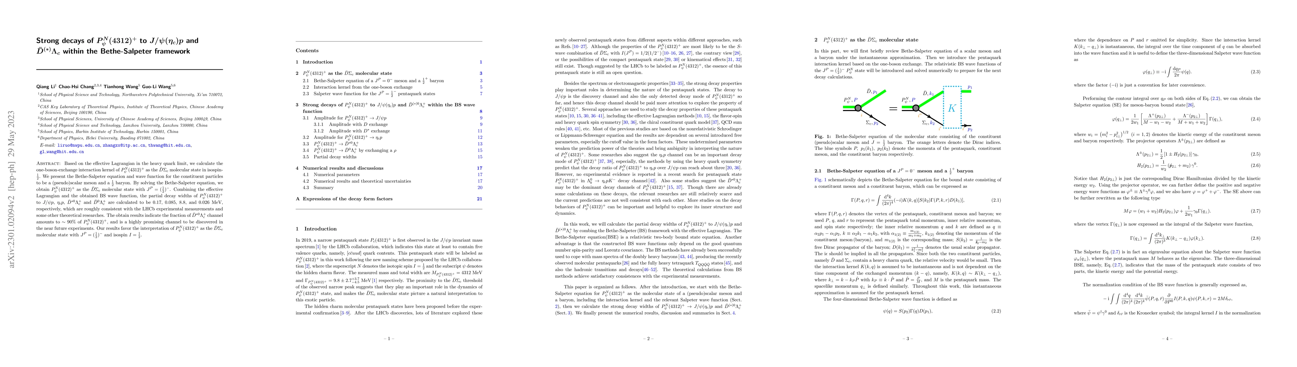 Based on the effective Lagrangian in the heavy quark limit, we calculate the one-boson-exchange interaction kernel of $P_\psi^N(4312)^+$ as the $\bar D\Sigma_c$ molecular state in isospin-$\frac12$. We present the Bethe-Salpeter equation and wave function for the constituent particles to be a (pseudo)scalar meson and a $\frac12$ baryon. By solving the Bethe-Salpeter equation, we obtain $P_\psi^N(4312)^+$ as the $\bar D\Sigma_c$ molecular state with $J^P=(\frac{1}{2})^-$. Combining the effective Lagrangian and the obtained BS wave function, the partial decay widths of $P_\psi^N(4312)^+$ to $J/\psi p$, $\eta_c p$, $\bar D^{*0}\Lambda_c^+$ and $\bar D^0\Lambda_c^+$ are calculated to be $0.17$, $0.085$, $8.8$, and $0.026$ MeV, respectively, which are roughly consistent with the LHCb experimental measurements and some other theoretical researches. The obtain results indicate the fraction of $\bar D^{*0}\Lambda_c^+$ channel amounts to $\sim90\%$ of $P_\psi^N(4312)^+$, and is a highly promising channel to be discovered in the near future experiments. Our results favor the interpretation of $P_\psi^N(4312)^+$ as the $\bar D\Sigma_c$ molecular state with $J^P=(\frac{1}{2})^-$ and isospin $I=\frac12$.