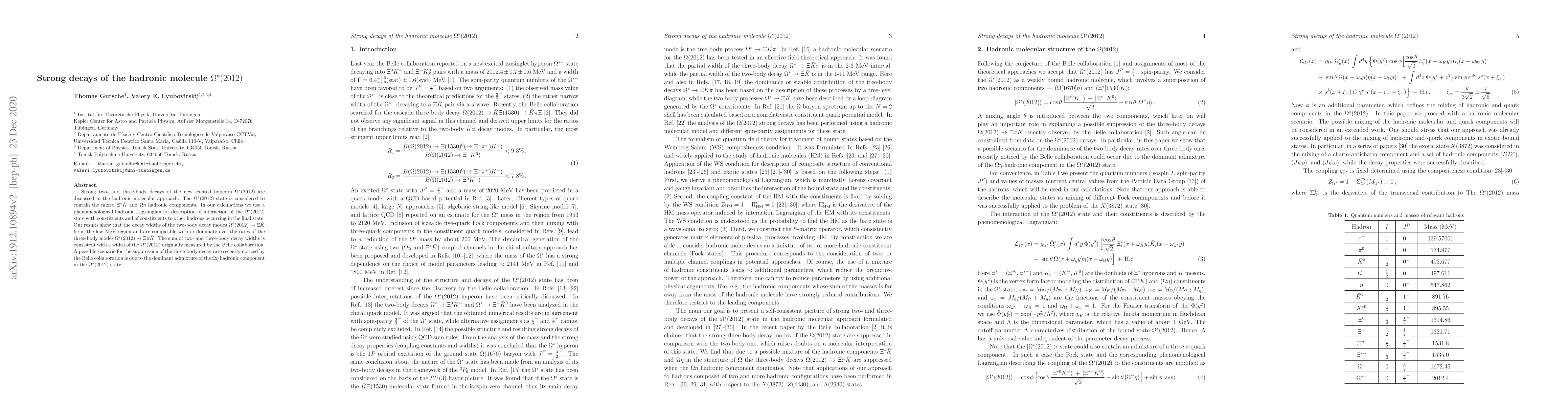 This paper investigates the strong decay processes of the excited hyperon $\Omega^*(2012)$ using a hadronic molecular approach, finding that the two-body decay $\Omega^*(2012) \to \Xi \bar K$ dominates over the three-body decay $\Omega^*(2012) \to \Xi \pi \bar K$, consistent with the observed decay width.