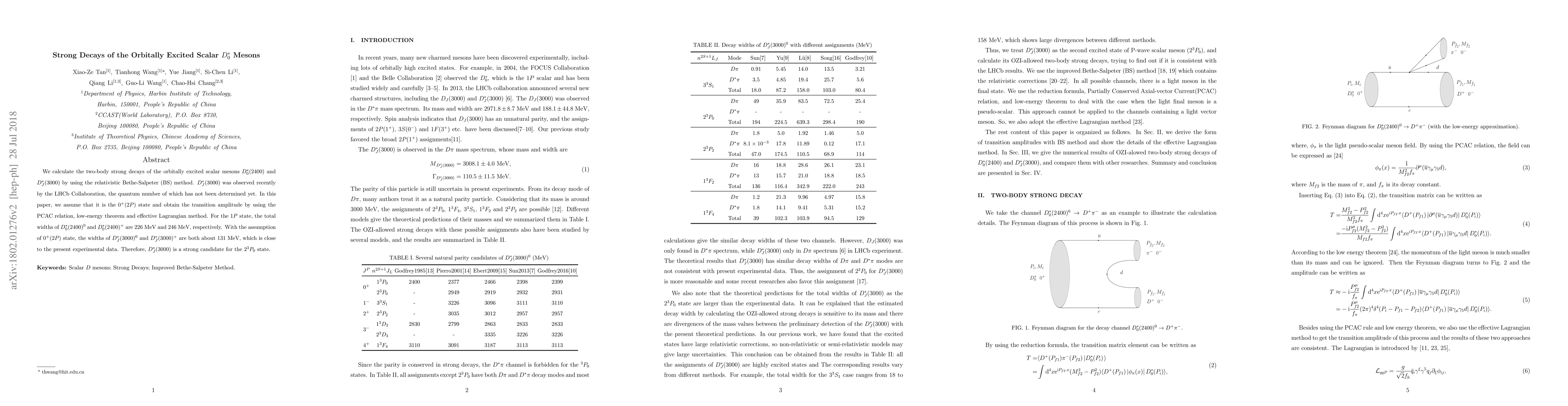 We calculate the two-body strong decays of the orbitally excited scalar mesons $D_0^*(2400)$ and $D_J^*(3000)$ by using the relativistic Bethe-Salpeter (BS) method. $D_J^*(3000)$ was observed recently by the LHCb Collaboration, the quantum number of which has not been determined yet. In this paper, we assume that it is the $0^+(2P)$ state and obtain the transition amplitude by using the PCAC relation, low-energy theorem and effective Lagrangian method. For the $1P$ state, the total widths of $D_0^*(2400)^{0}$ and $ D_0^*(2400)^+$ are 226 MeV and 246 MeV, respectively. With the assumption of $0^+(2P)$ state, the widths of $D_J^*(3000)^0$ and $D_J^*(3000)^+$ are both about 131 MeV, which is close to the present experimental data. Therefore, $D_J^*(3000)$ is a strong candidate for the $2^3P_0$ state.