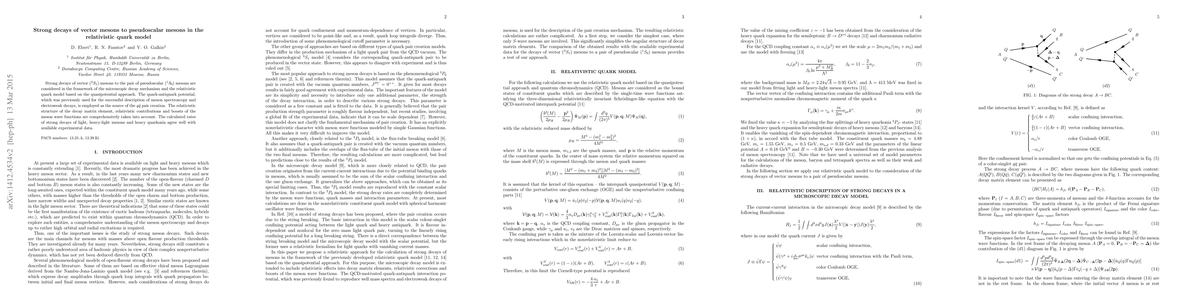 This paper explores the strong decay processes of vector mesons to pseudoscalar mesons using the relativistic quark model and quasipotential approach. The study accurately predicts decay rates for light, heavy-light, and heavy quarkonia mesons, aligning well with experimental data.