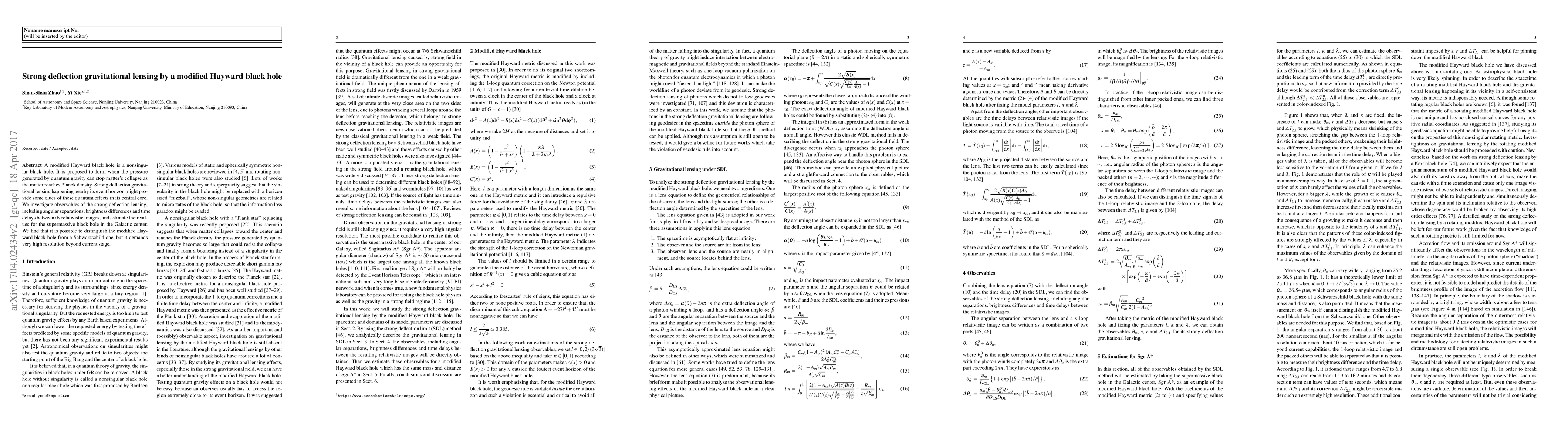This paper explores strong deflection gravitational lensing by a nonsingular modified Hayward black hole, aiming to detect quantum gravity effects. It investigates angular separations, brightness differences, and time delays in relativistic images, finding that distinguishing this black hole from a Schwarzschild one is feasible but requires future high-resolution observations.