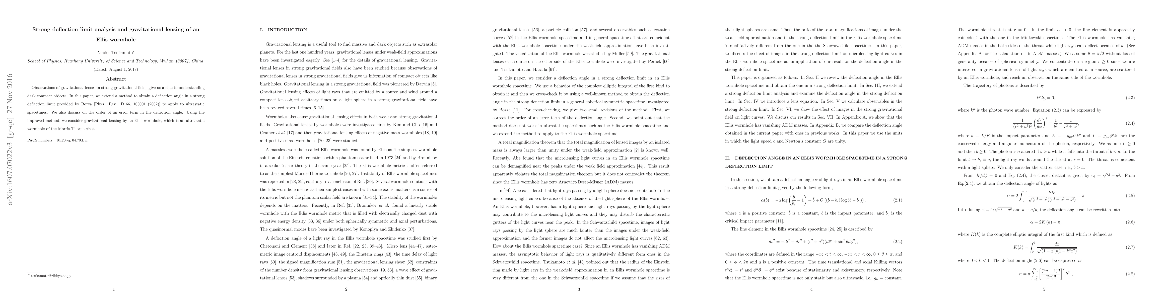 This paper extends Bozza's strong deflection limit method to ultrastatic spacetimes, specifically applying it to Ellis wormholes. It also analyzes the gravitational lensing effects and the error term order in the deflection angle for these wormholes.