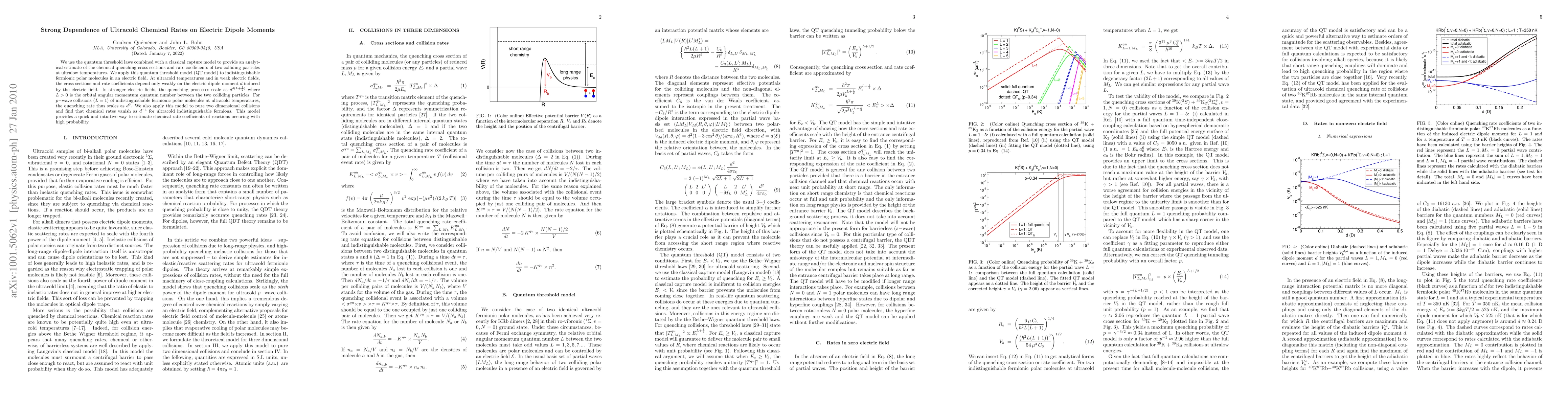 We use the quantum threshold laws combined with a classical capture model to provide an analytical estimate of the chemical quenching cross sections and rate coefficients of two colliding particles at ultralow temperatures. We apply this quantum threshold model (QT model) to indistinguishable fermionic polar molecules in an electric field. At ultracold temperatures and in weak electric fields, the cross sections and rate coefficients depend only weakly on the electric dipole moment d induced by the electric field. In stronger electric fields, the quenching processes scale as d^{4(L+1/2)} where L>0 is the orbital angular momentum quantum number between the two colliding particles. For p-wave collisions (L=1) of indistinguishable fermionic polar molecules at ultracold temperatures, the quenching rate thus scales as d^6. We also apply this model to pure two dimensional collisions and find that chemical rates vanish as d^{-4} for ultracold indistinguishable fermions. This model provides a quick and intuitive way to estimate chemical rate coefficients of reactions occuring with high probability.