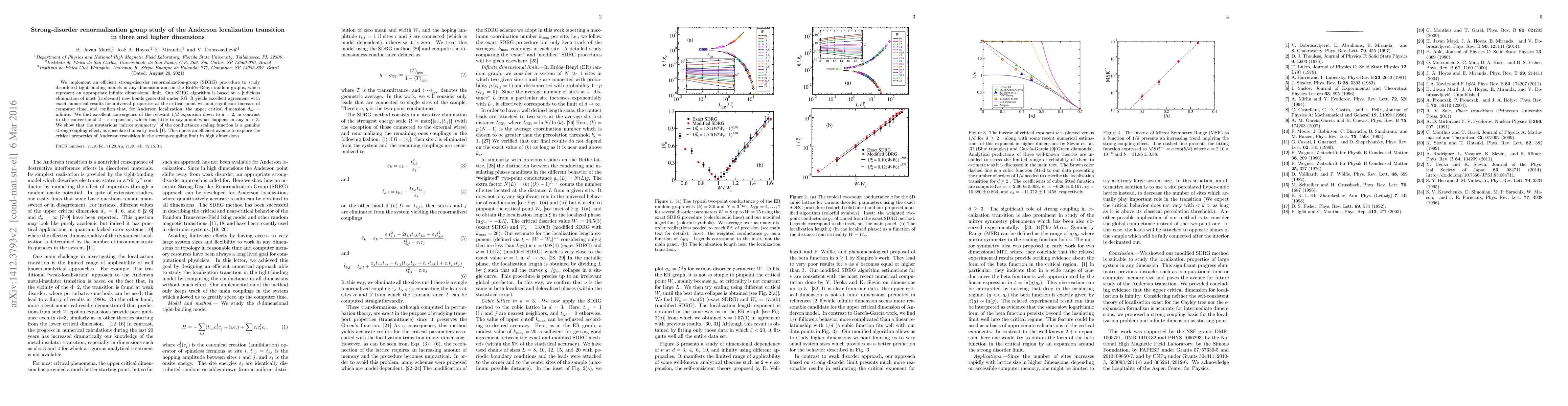 This paper employs a strong-disorder renormalization group (SDRG) method to study Anderson localization in disordered systems across various dimensions, confirming that the upper critical dimension is infinite. The SDRG algorithm effectively captures universal properties at the critical point, revealing a genuine strong-coupling effect in the conductance scaling function and providing a robust approach for exploring high-dimensional critical properties.