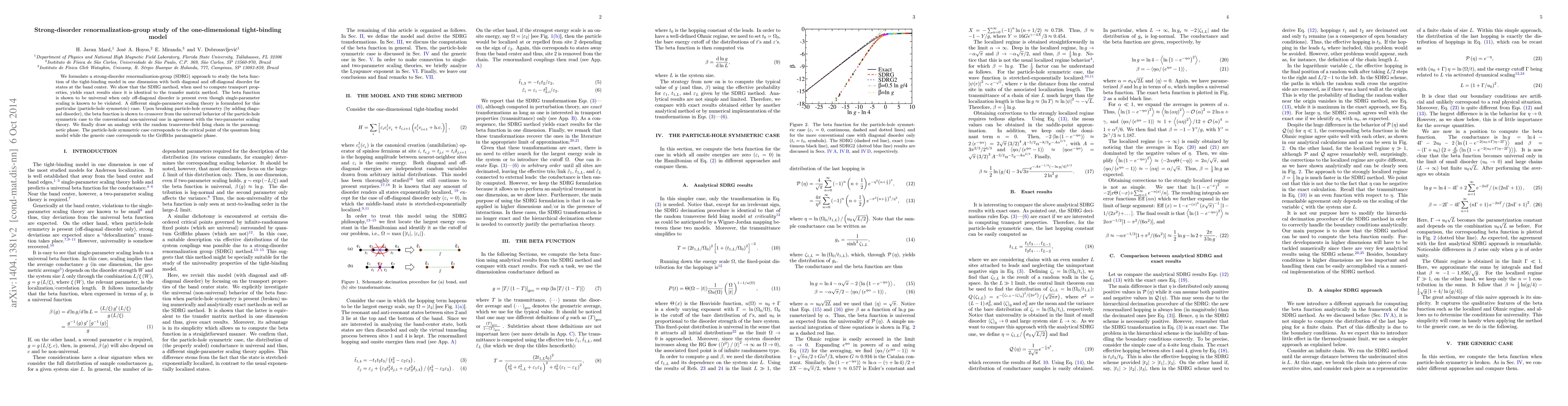 We formulate a strong-disorder renormalization-group (SDRG) approach to study the beta function of the tight-binding model in one dimension with both diagonal and off-diagonal disorder for states at the band center. We show that the SDRG method, when used to compute transport properties, yields exact results since it is identical to the transfer matrix method. The beta function is shown to be universal when only off-diagonal disorder is present even though single-parameter scaling is known to be violated. A different single-parameter scaling theory is formulated for this particular (particle-hole symmetric) case. Upon breaking particle-hole symmetry (by adding diagonal disorder), the beta function is shown to crossover from the universal behavior of the particle-hole symmetric case to the conventional non-universal one in agreement with the two-parameter scaling theory. We finally draw an analogy with the random transverse-field Ising chain in the paramagnetic phase. The particle-hole symmetric case corresponds to the critical point of the quantum Ising model while the generic case corresponds to the Griffiths paramagnetic phase.