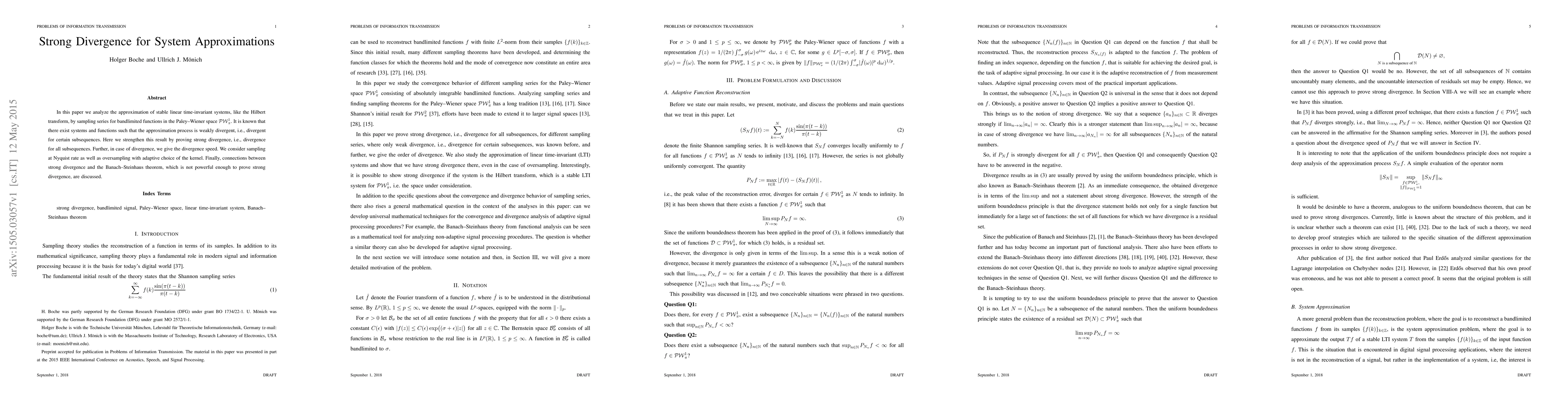 In this paper we analyze the approximation of stable linear time-invariant systems, like the Hilbert transform, by sampling series for bandlimited functions in the Paley-Wiener space $\mathcal{PW}_{\pi}^{1}$. It is known that there exist systems and functions such that the approximation process is weakly divergent, i.e., divergent for certain subsequences. Here we strengthen this result by proving strong divergence, i.e., divergence for all subsequences. Further, in case of divergence, we give the divergence speed. We consider sampling at Nyquist rate as well as oversampling with adaptive choice of the kernel. Finally, connections between strong divergence and the Banach-Steinhaus theorem, which is not powerful enough to prove strong divergence, are discussed.