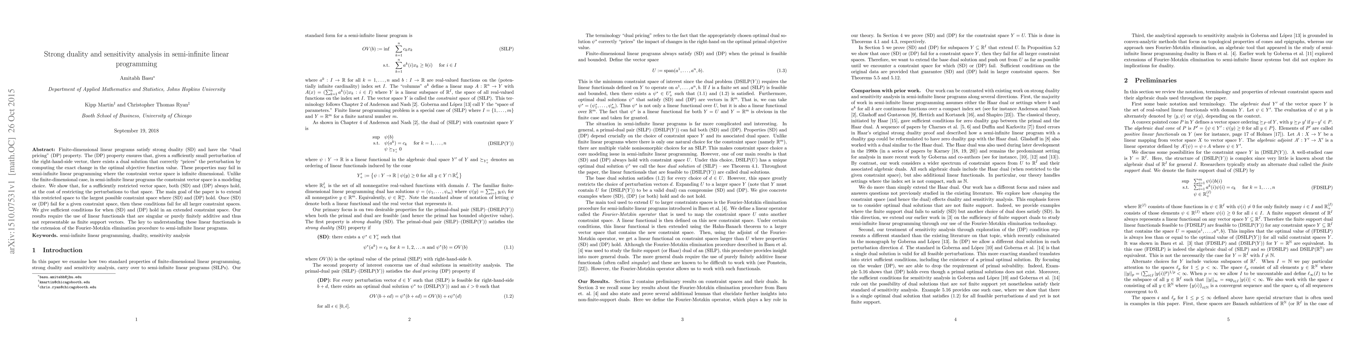 Finite-dimensional linear programs satisfy strong duality (SD) and have the "dual pricing" (DP) property. The (DP) property ensures that, given a sufficiently small perturbation of the right-hand-side vector, there exists a dual solution that correctly "prices" the perturbation by computing the exact change in the optimal objective function value. These properties may fail in semi-infinite linear programming where the constraint vector space is infinite dimensional. Unlike the finite-dimensional case, in semi-infinite linear programs the constraint vector space is a modeling choice. We show that, for a sufficiently restricted vector space, both (SD) and (DP) always hold, at the cost of restricting the perturbations to that space. The main goal of the paper is to extend this restricted space to the largest possible constraint space where (SD) and (DP) hold. Once (SD) or (DP) fail for a given constraint space, then these conditions fail for all larger constraint spaces. We give sufficient conditions for when (SD) and (DP) hold in an extended constraint space. Our results require the use of linear functionals that are singular or purely finitely additive and thus not representable as finite support vectors. The key to understanding these linear functionals is the extension of the Fourier-Motzkin elimination procedure to semi-infinite linear programs.