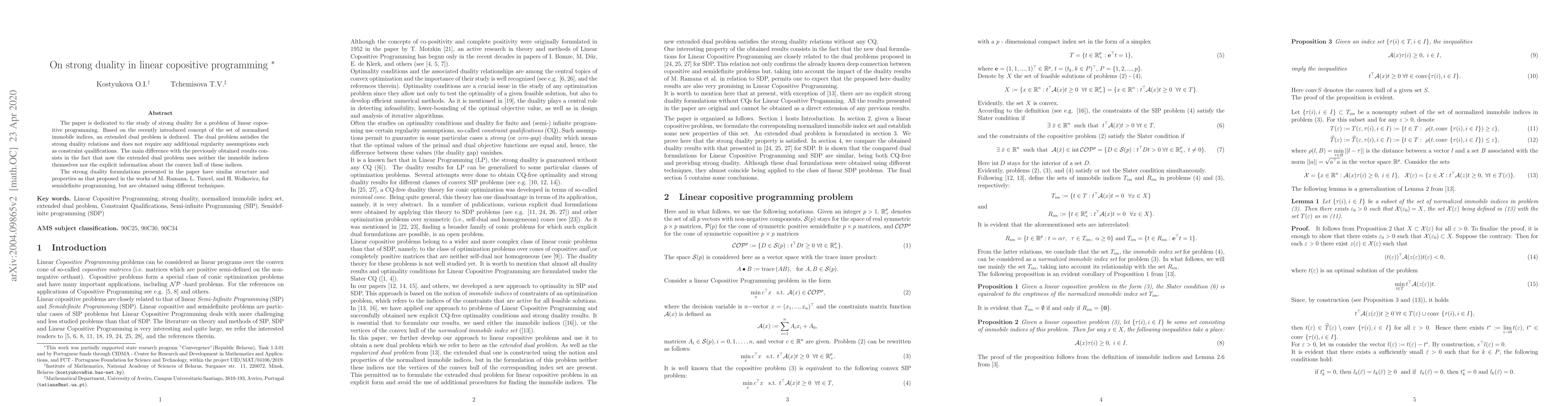 Researchers developed strong duality formulations for linear copositive programming without requiring additional regularity assumptions, using a new concept called the set of normalized immobile indices.