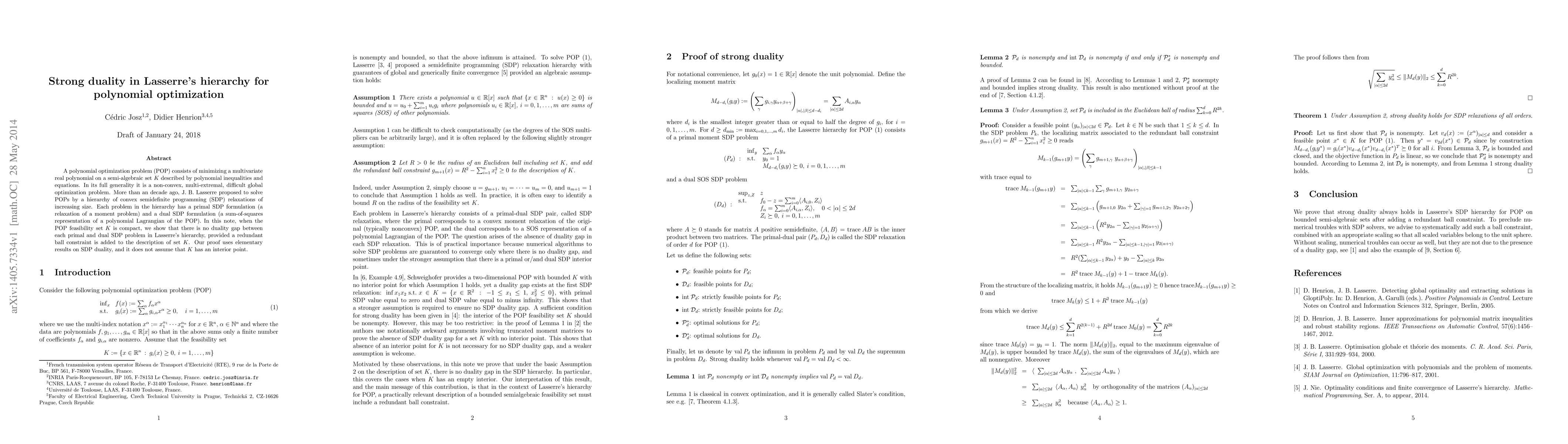 This paper demonstrates strong duality in Lasserre's hierarchy for polynomial optimization when the feasibility set is compact, provided a redundant ball constraint is included. The authors prove that there is no duality gap between primal and dual semidefinite programming relaxations without assuming the feasibility set has an interior point.