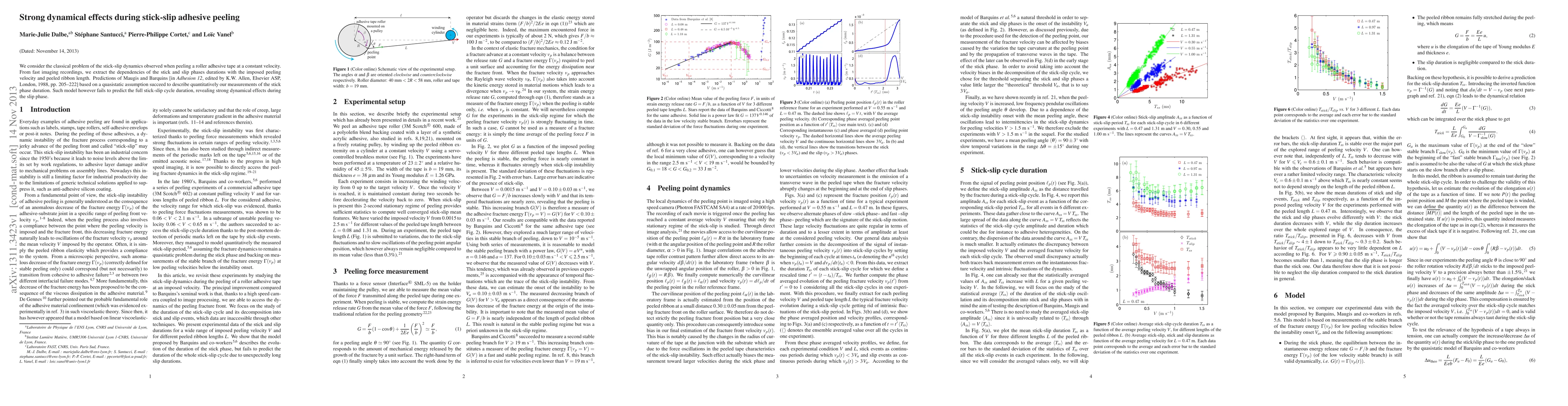 This study investigates the stick-slip dynamics during adhesive tape peeling, finding that while Maugis and Barquins' quasistatic model accurately predicts stick phase durations, it fails to account for the full stick-slip cycle duration, indicating significant dynamical effects during the slip phase.