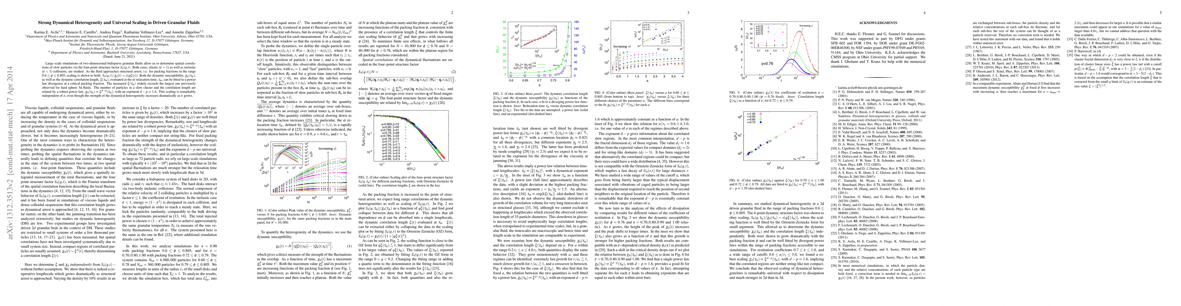 Large scale simulations of two-dimensional bidisperse granular fluids allow us to determine spatial correlations of slow particles via the four-point structure factor $S_4(q,t)$. Both cases, elastic ($\varepsilon=1$) as well as inelastic ($\varepsilon < 1$) collisions, are studied. As the fluid approaches structural arrest, i.e. for packing fractions in the range $0.6 \le \phi \le 0.805$, scaling is shown to hold: $S_4(q,t)/\chi_4(t)=s(q\xi(t))$. Both the dynamic susceptibility, $\chi_4(\tau_{\alpha})$, as well as the dynamic correlation length, $\xi(\tau_{\alpha})$, evaluated at the $\alpha$ relaxation time, $\tau_{\alpha}$, can be fitted to a power law divergence at a critical packing fraction. The measured $\xi(\tau_{\alpha})$ widely exceeds the largest one previously observed for hard sphere 3d fluids. The number of particles in a slow cluster and the correlation length are related by a robust power law, $\chi_4(\tau_{\alpha}) \approx\xi^{d-p}(\tau_{\alpha})$, with an exponent $d-p\approx 1.6$. This scaling is remarkably independent of $\varepsilon$, even though the strength of the dynamical heterogeneity increases dramatically as $\varepsilon$ grows.